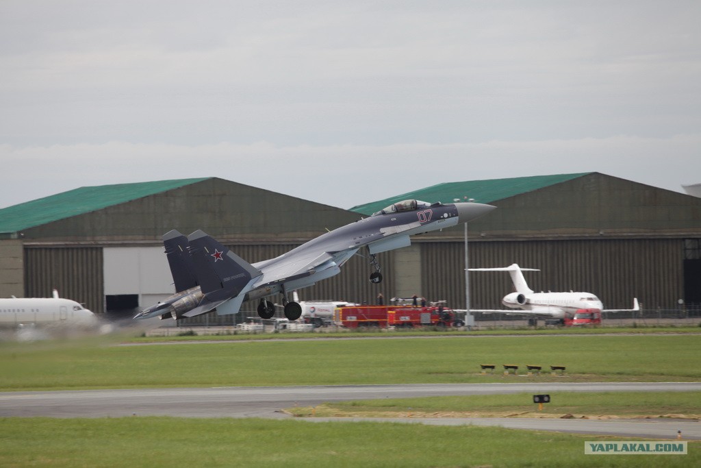 Су-35, действительно, за рамками .... Нет слов. Там, какой-то, англоязычный, "обозвал" НЛО, действительно, по другому и не опишешь. Машина, уходит, "свечой" в небо, с ускорением, ощущение, что, улетит, в космос. Потом, зависает, в "плоском штопоре", или как это называется, впечатление, что, у неё, не управляемый вектор тяги, а управляемый вектор гравитации. Кроме, всего, просто, красивая машина. Пожарные, которые, дежурили, на поле (это уже седьмой день салона), все полёты, сидели, в машинах, к полёту Сухого, вылезли, на крыши, своих, машин, чтоб, лучше видеть.