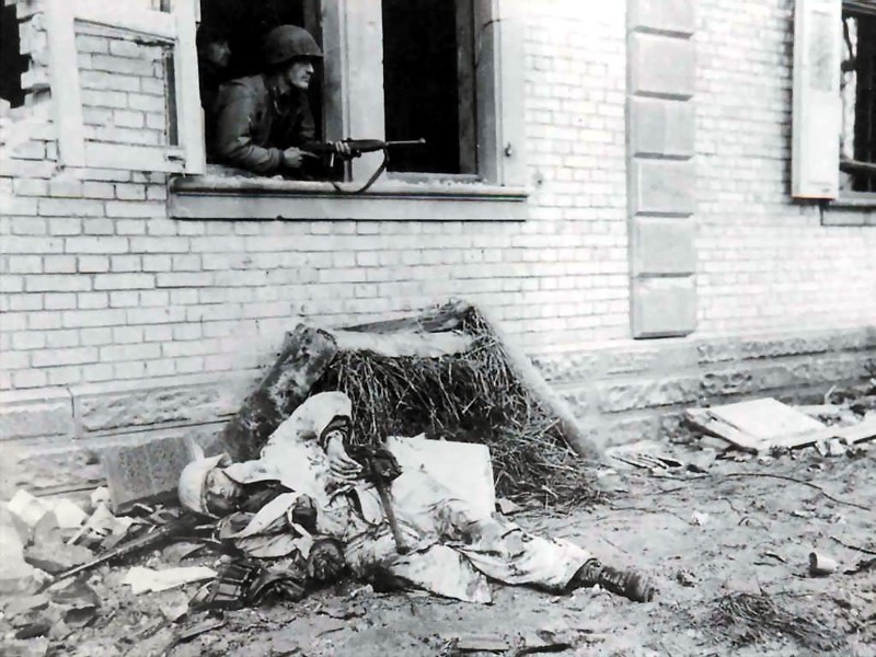 Американский пехотинец позирует рядом с телом убитого немецкого солдата