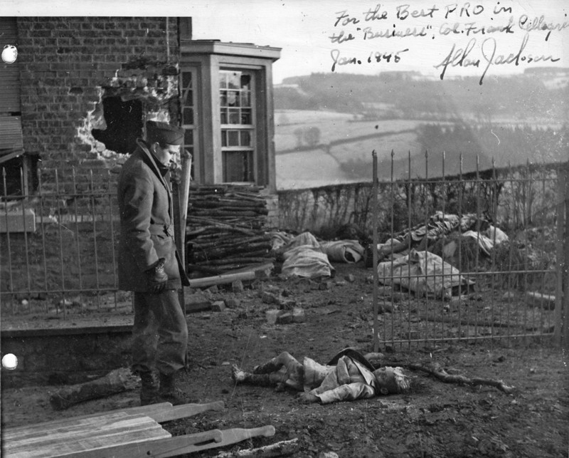 Американский солдат возле тел убитых немцами мирных жителей. Ставело, Бельгия, январь 1945-го года