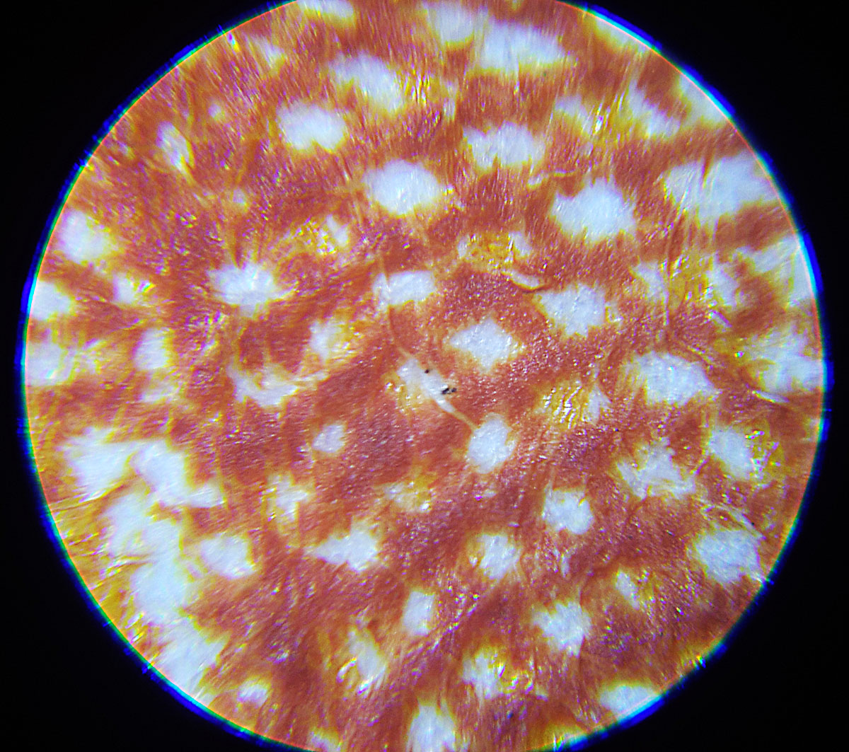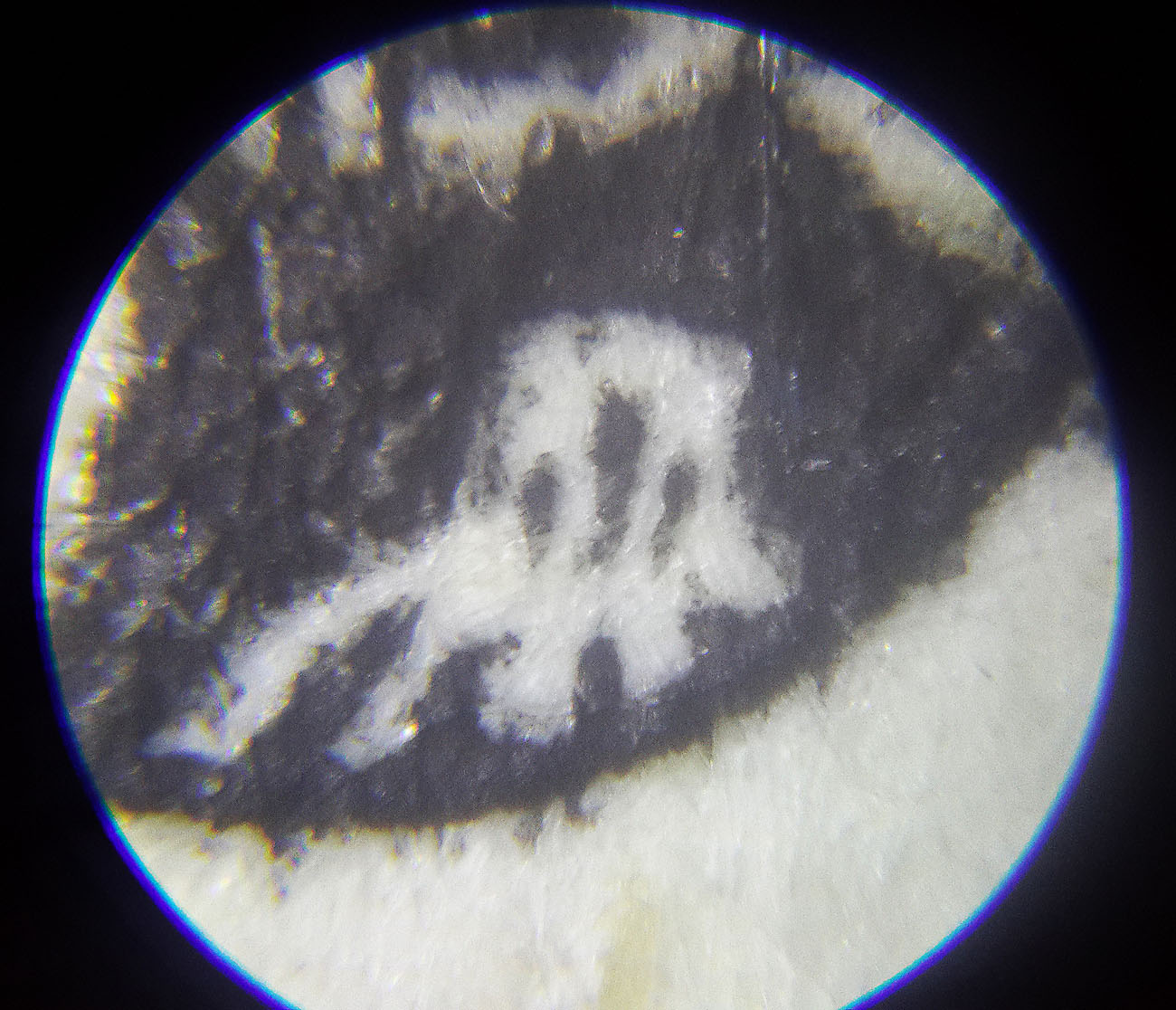 38. Татуировка. Точнее, это граница кожи и татуировки на ней. Слева черная татуировка, справа светлая кожа. Издалека.