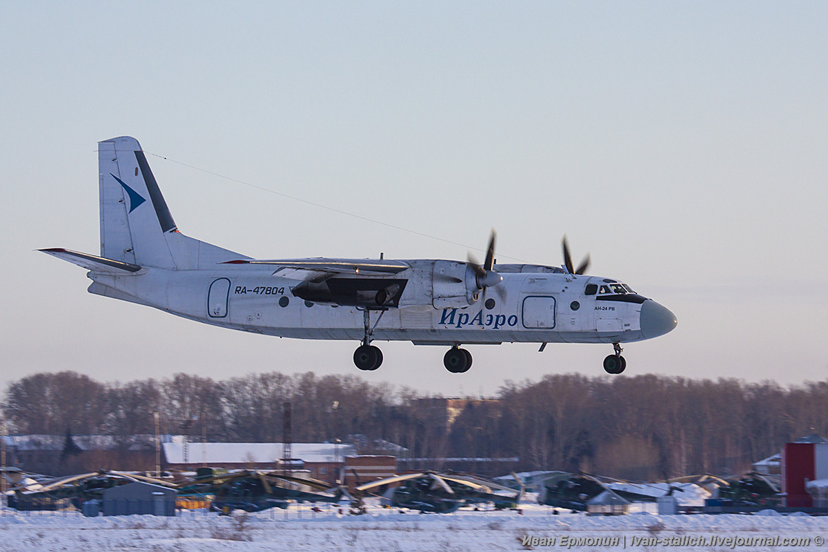 33. Следом прилетел Ан-24РВ, RA-47804, ИрАэро. На заднем плане видны винтокрылые машины, которые тоже базируются в Толмачево.