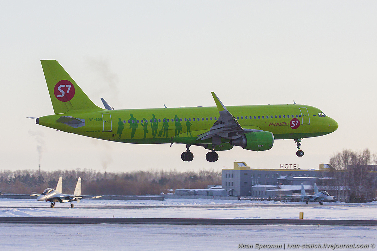 32. Тем не менее гражданский трафик никто не отменял. Садится Airbus A320-214, VP-BOG, S7 Airlines. А "Сухари" ждут на РД Альфа.
