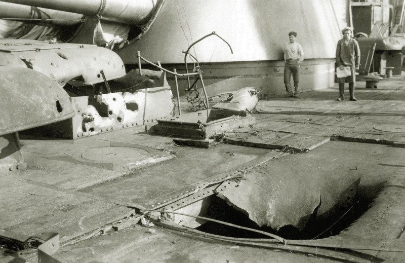 Судя по размеру пробоины в палубе, получил попадание от орудий фортов, вероятно с "Красной горки"