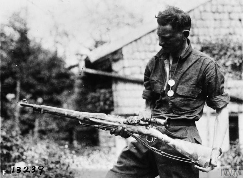 Американский стрелок демонстрирует свою снайперскую винтовку M1903А4 Springfield с нанесённой на нее маскировочной окраской; Франция; район коммуны Бадонвиллер; май 1918-го года.