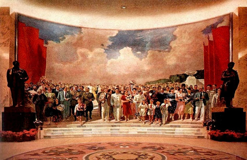 Войдя через главные двери справа, взгляду посетителей открывалось огромное панно размером 16 на 9 метров с изображением рабочих, летчиков, полярников, артистов, ученых и прочих героев страны советов, идущих общей дорогой социализма навстречу светлому будущему. Работа называлась "Знатные люди страны Советов", и была выполнена коллективом из 11 художников под руководством Василия Ефанова.