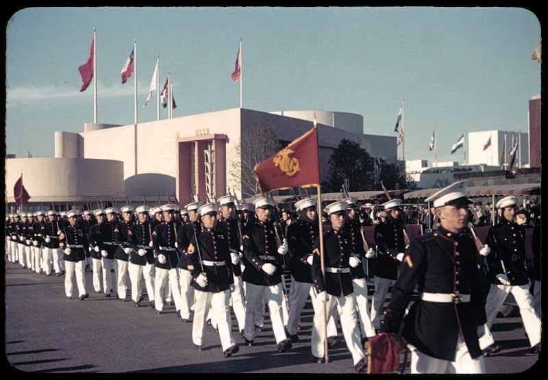 Вокруг него располагались меньшие по размеру гербы одиннадцати республик входящих в Советский Союз. Гербы были выполнены из драгоценных и полу-драгоценных камней. 34. Морские пехотинцы маршируют на фоне советской экспозиции в Холле Наций.