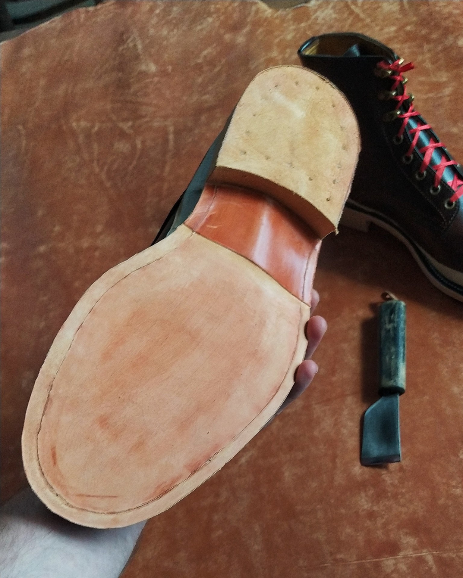 Урез подошвы, каблука и кожаную часть подошвы крашу в черный цвет и обрабатываю.