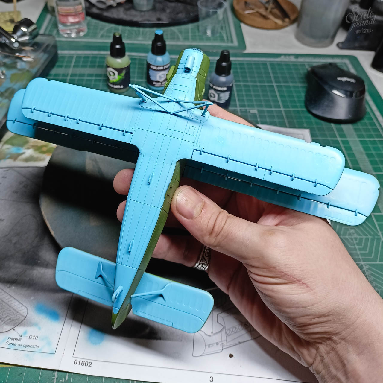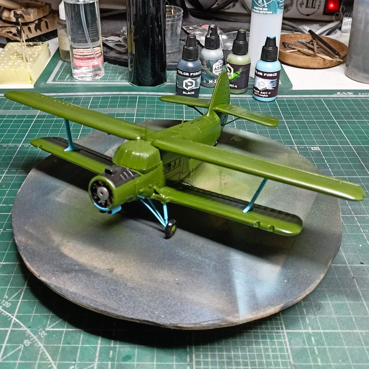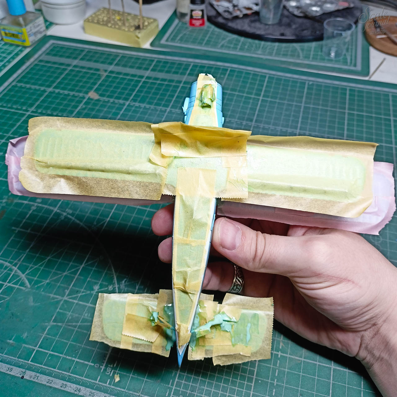 Задул низ самолета краской АМТ-7 голубой. И после высыхания закрыл масками для нанесения следующего цвета