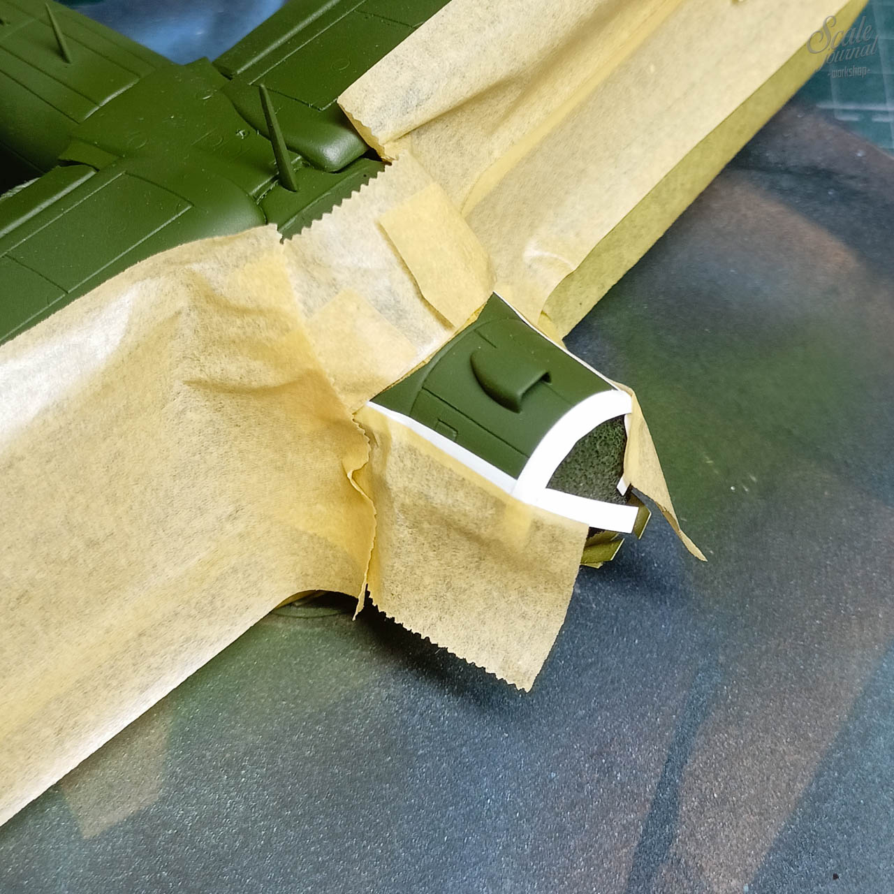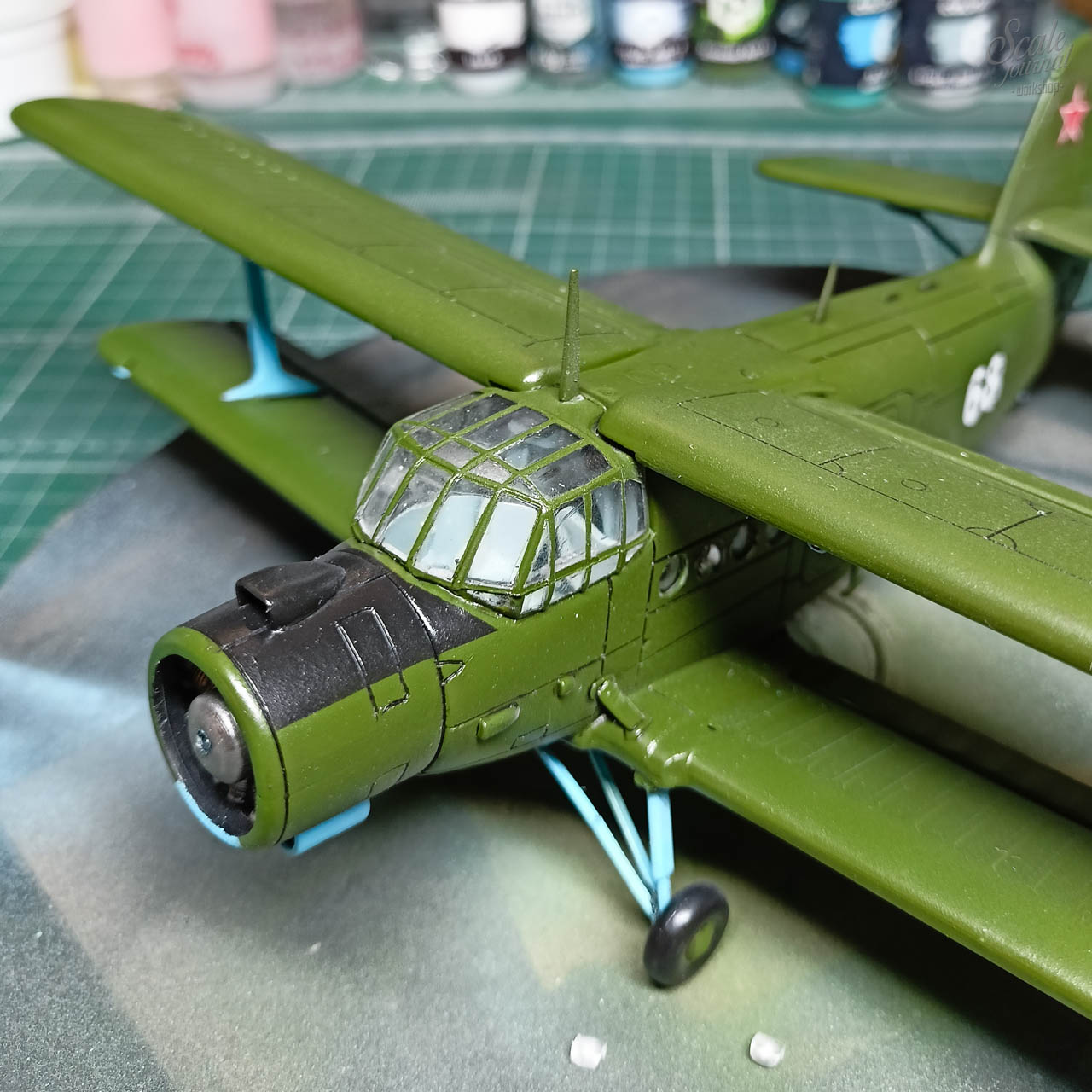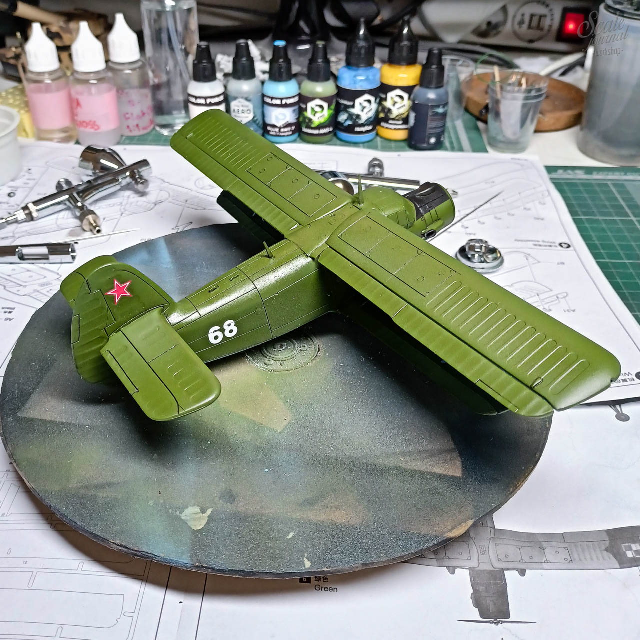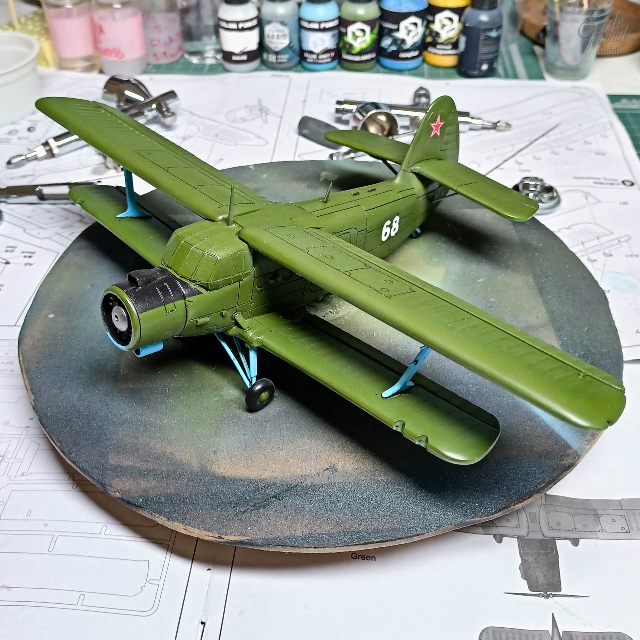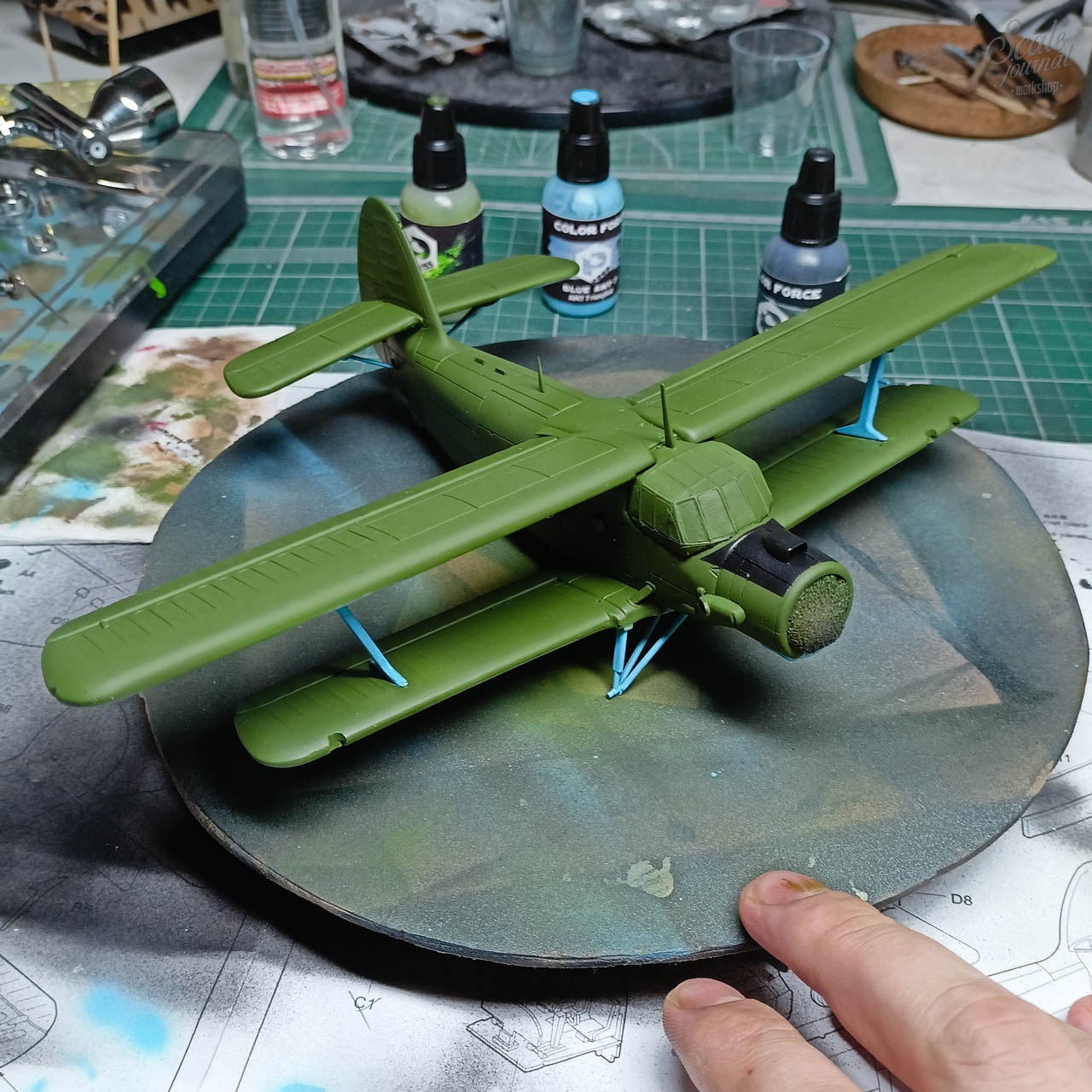 Потом нанес базовый АМТ-4 зеленый на оставшуюся часть самолета и снова поработал масками в районе капота двигателя.