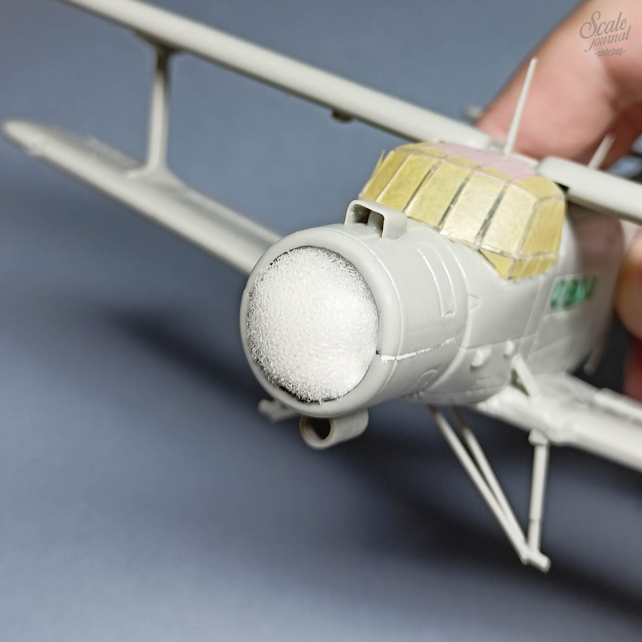 Перед покраской снял винт и колеса шасси, буду красить отдельно и закрыл движок поролоном.