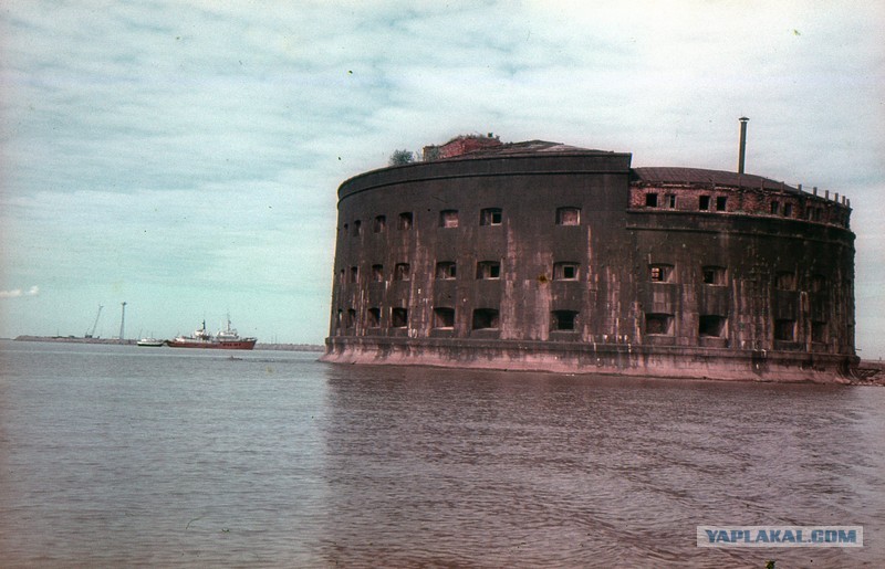 В 1987 году путешествуя на двух машинах мы заночевали с приятелем в г. Ломоносов прямо на берегу Финского залива. Проснувшись утром обнаружили старичка, который прямо у воды пилил двуручной пилой огромное бревно, он вылавливал их в заливе и этим топился. Пока наши спали в машинах мы с приятелем что бы согреться в утренней прохладе решили дедушке помочь без всякой задней мысли. Каково же было наше удивление, когда дедушка решил нас за это отблагодарить и прокатить по Финскому заливу. Не помню, что у него была за лодка, возможно Прогресс, но взять всех он не мог, на берегу остались дамы. Они сами так решили, потому что мы как бы это и заработали. Вот мы с детьми и поплыли. Сначала он отвез нас на форт, который был уничтожен во время войны. Осталась от форта только треснутая винтовая кирпичная лестница. а все остальное представляло груду кирпича. А потом он отвез нас и на этот Чумовой форт. Он никем не охранялся тогда.
