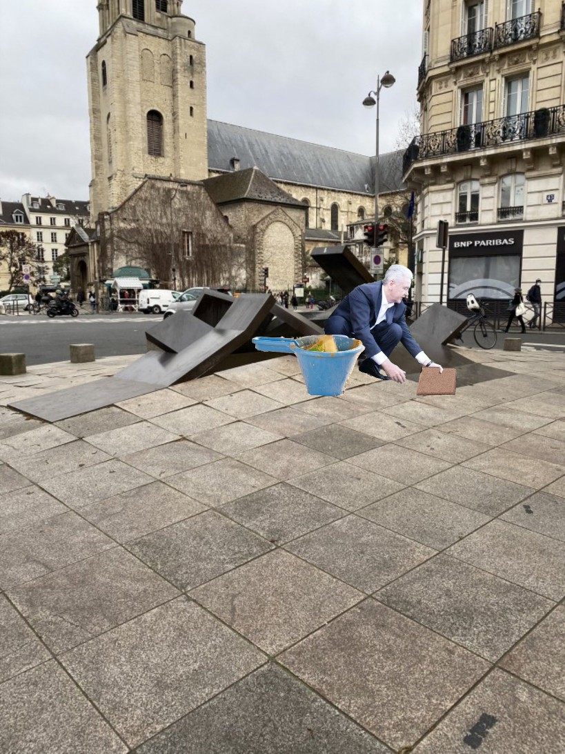 Ну если в Париже так чтят седовласого гуру плитки и бордюрного камня, может заберут его к себе? А если серьезно - забавное сходство. Не хватает еще бордюров и укладки асфальта в лужи