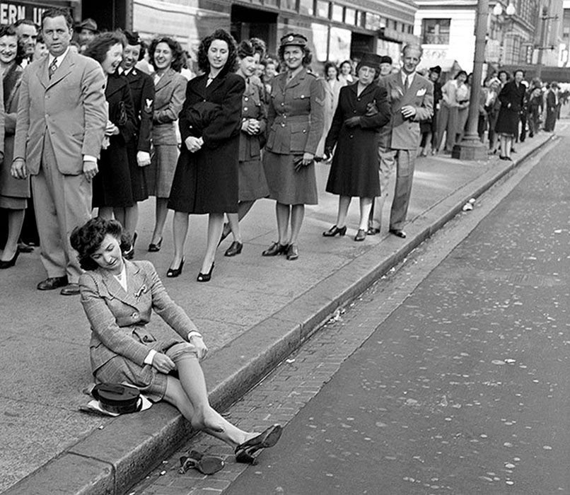 Люди выстраиваются в очереди во время распродажи чулок в Вашингтоне, 1945 год.