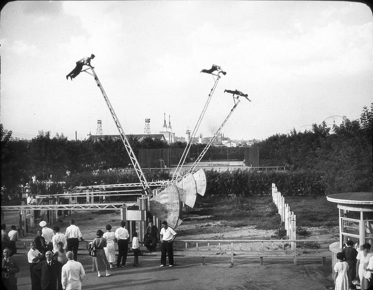 Аттракцион “Летающие люди” стоял в Парке Горького в 1937 году. Сеанс стоил 10 копеек и состоял из 5-6 полетов по дуге в 180 градусов. Почти половину всего времени человек проводил вверх тормашками.