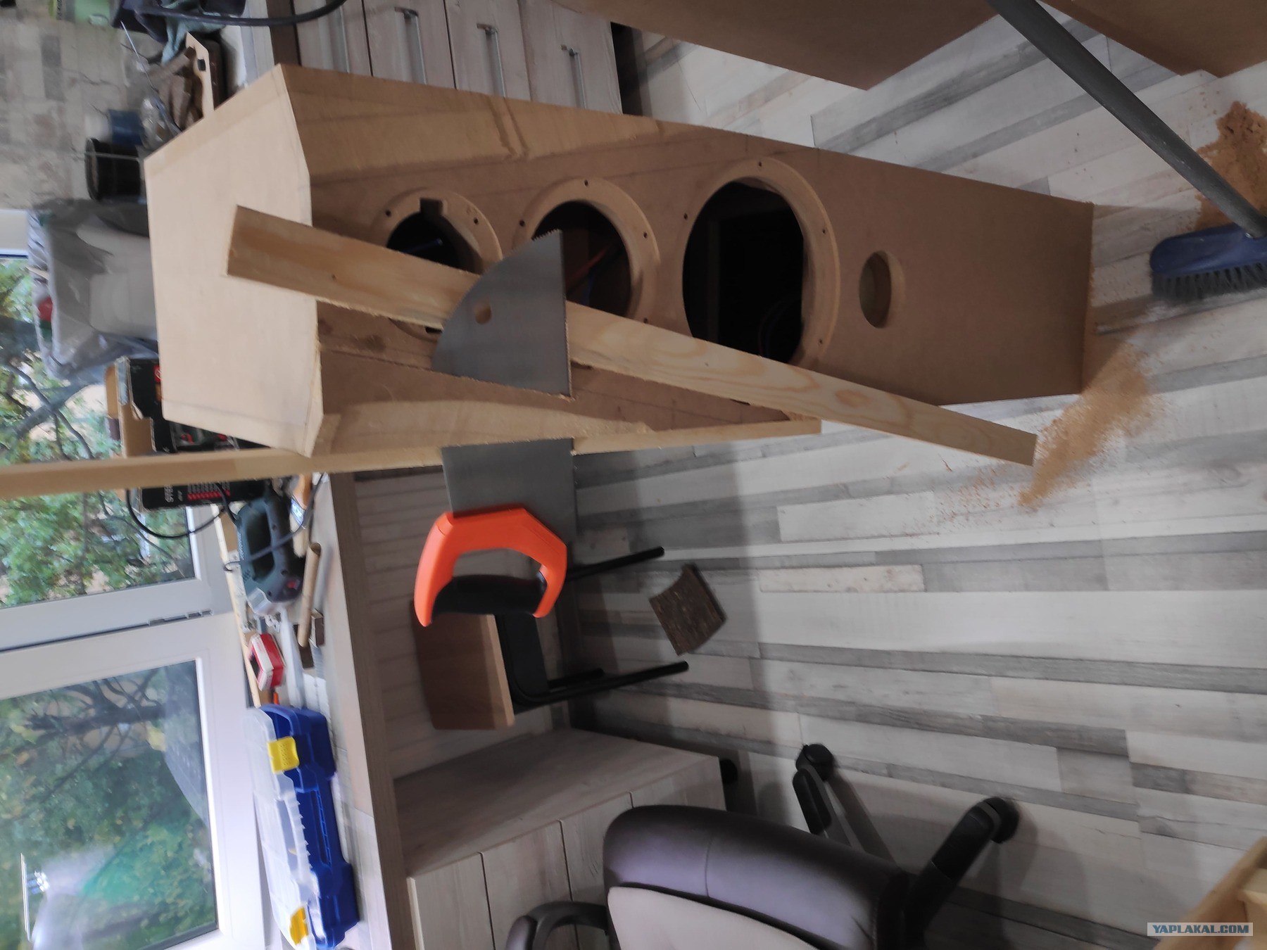 Ах, да , после сборки и высыхания клея , все саморезы удаляются, а вместо них, на тот же столяр с предварительным засверливанием устанавливаются мебельные шканты. После этого, сверлом форстнера делается углубление под будущую шпаклевку, далее покажу