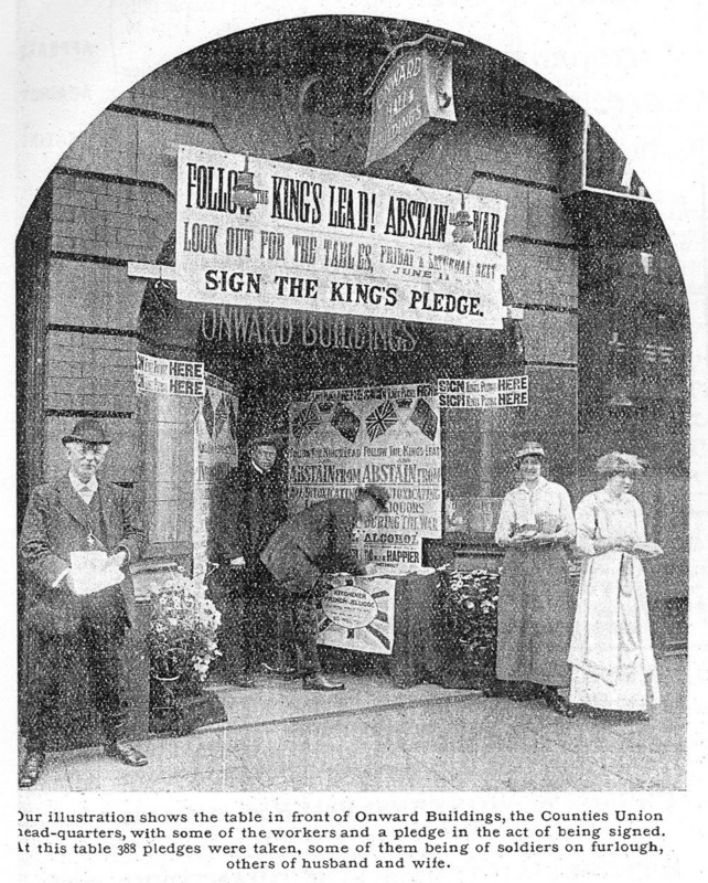 Карикатура, нарисованая Артуром Джонсоном для немецкого журнала Kladderadatsch, высмеевает британскую антиалкогольную кампанию, которую возглавли Дэвид Ллойд Джордж и корольем Георг V, который пообещал, что королевский двор не будет пить, пока война не закончится.