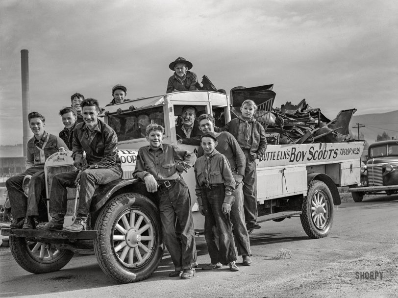 Скауты с грузовиком металлолома во время кампании по сбору вторсырья. Бьют, Монтана. США. Октябрь 1942 года. Фотограф: Рассел Ли для Управления по информации о военном времени.
