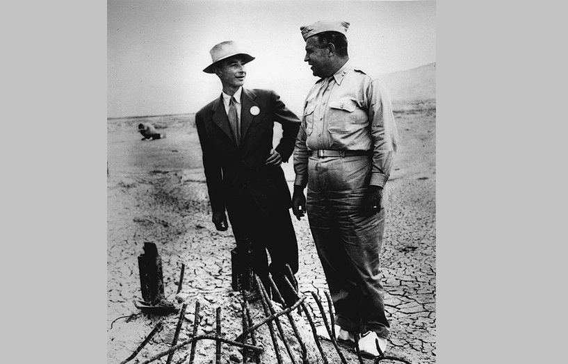 39 Сентябрь 1945 года. Роберт Оппенгеймер (слева) и генерал Лесли Гроувс на месте испытаний ядерной бомбы