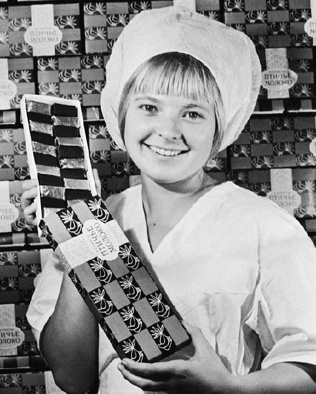 24 Кондитер Ольга Брызгина демонстрирует шоколадные конфеты «Птичье молоко», 1976 год.