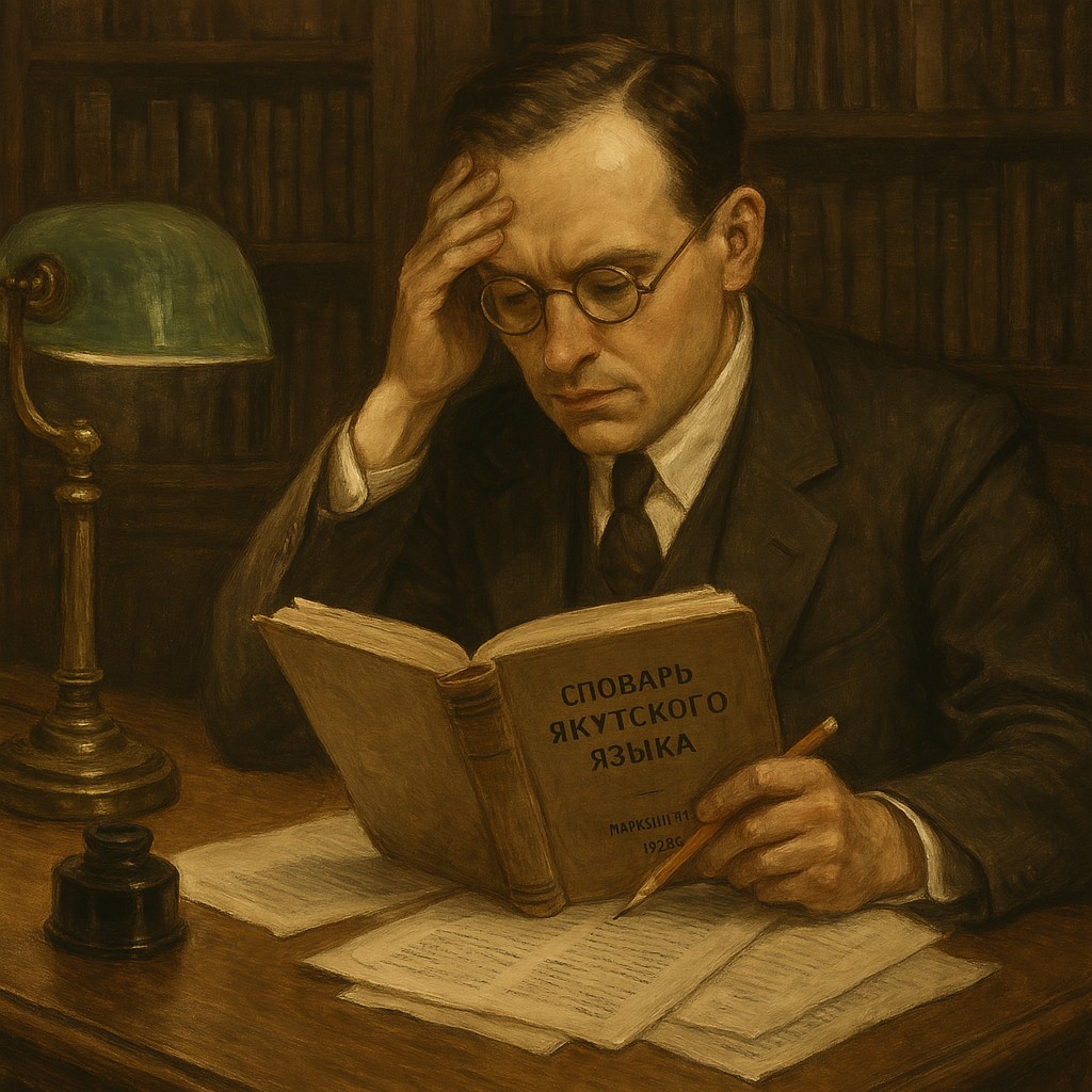 В полумраке узкой библиотеки, где лампа коптит воздух и запах старины проникает в саму ткань времени, он сидел, подперев лоб рукой. Казалось, будто напряжённая складка между бровями могла приоткрыть какую-то дверцу в иные миры. На столе лежал потертый том — «Словарь якутского языка», изданный Наркомпросом в 1925 году.