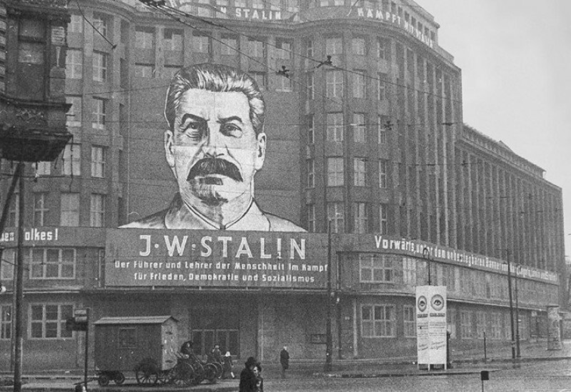 Транспарант с портретом Сталина на здании Центрального Комитета Социалистической единой партии Германии. Восточный Берлин, ГДР. 1950