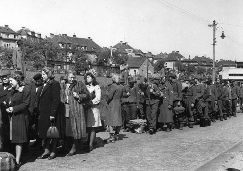 Местные немцы и пленные немецкие солдаты конвоируются чехословаками к месту казни. Прага, ул. Кладенска. 40 немцев было арестовано в жилых районах города, сколько было военнопленных неизвестно. Их согнали в кинотеатр «Бopжиcлaвкa». Позже бойцы Революционной гвардии их расстреляли. 10.05.1945 г.