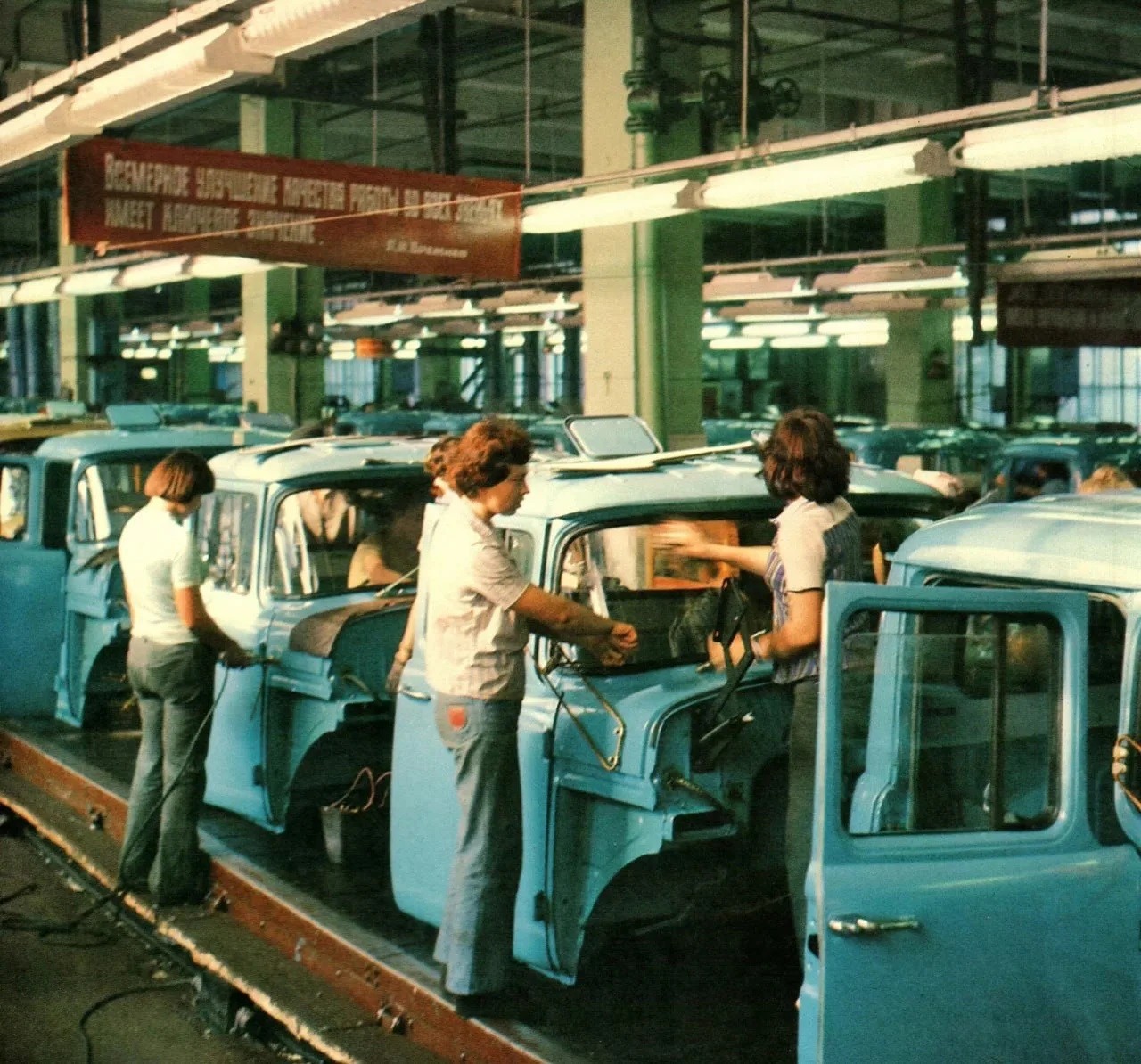 45 Конвейер сборки кабин в старом кузовном корпусе Завода им. Лихачёва, Москва, СССР. 1979 год