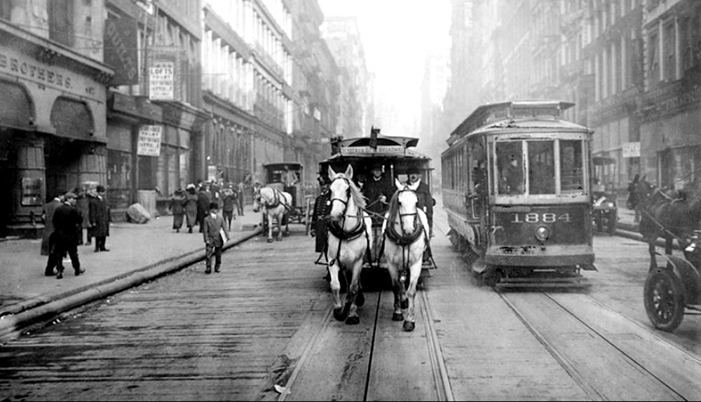 Последние общественные конки рядом с трамваями, Нью-Йорк, 1917 год