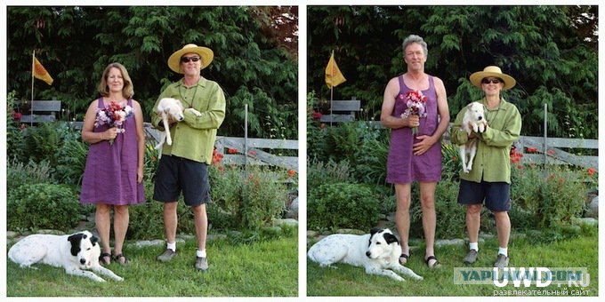 Канадский фотограф Хана Песут сделала эту интересную серию фотографий под названием «Неожиданные перемены». На первом снимке обычна пара, на втором – та же пара, те же декорации, те же позы, только пара поменялась… одеждой. Смешнее всего получается, когда в паре большая разница в росте, или когда они пытаются скопировать позы друг друга.