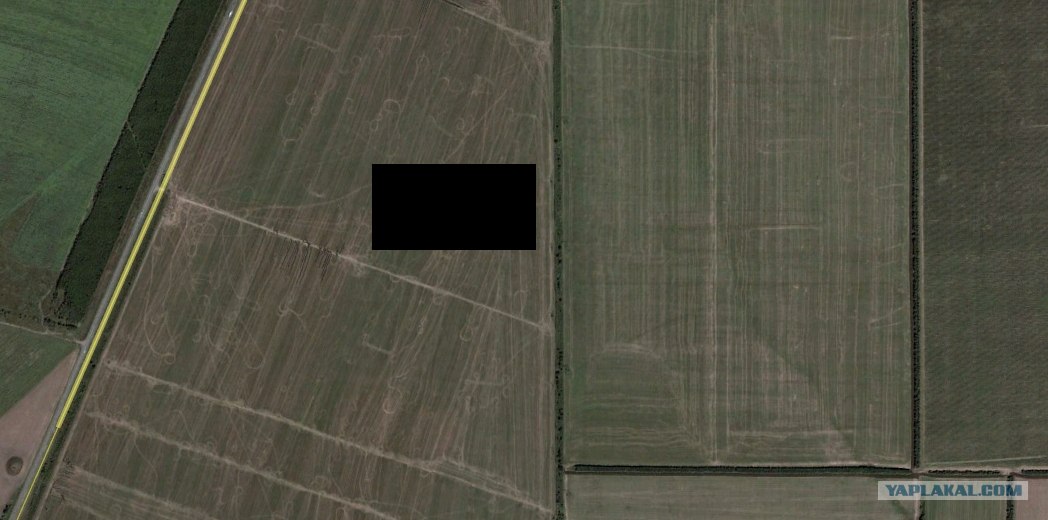 Это один из самых странных образцов цензуры в Google Maps – это место просто закрашено зелёным. Территория завода удалена, здания стёрты, и всё что вы можете видеть – это обычная трава.