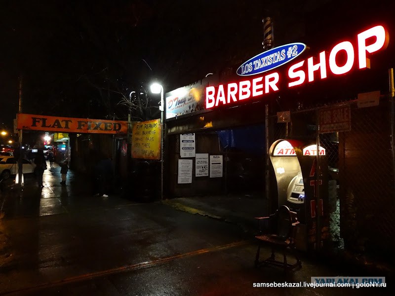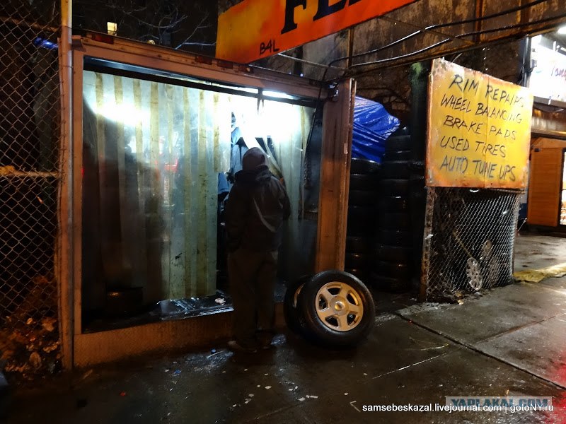 42. А еще мне "повезло". Я проколол колесо и пришлось искать ближайший шиномонтаж. Он меня поразил до глубины души. Заведение на Манхеттене ничем не отличалось от подобного шиномонтажа где-нибудь в России. Такой же грязный контейнер, внутри те же колеса на продажу, точно такое же грязное корыто с водой для проверки шин и точно такой же балансировочный станок. Заделать прокол мне обошлось в 7 долларов.