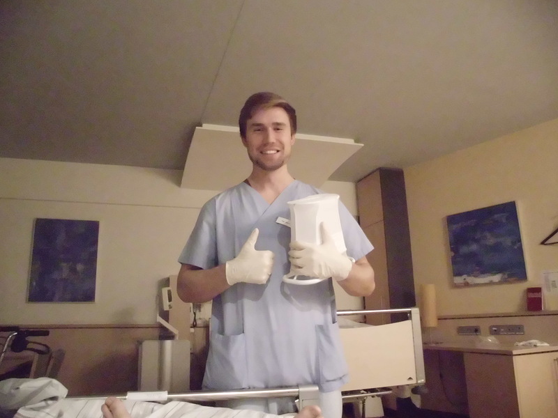 41. Про антитромбозные чулки. в которых я должен был щеголять всё время, я писал. Надеть их самому. даже со здоровой спиной проблематично, существует специальное приспособление для их одевания. Вот как раз практикант Тим с таким девайсом собирается облечь мои ноги после душа.