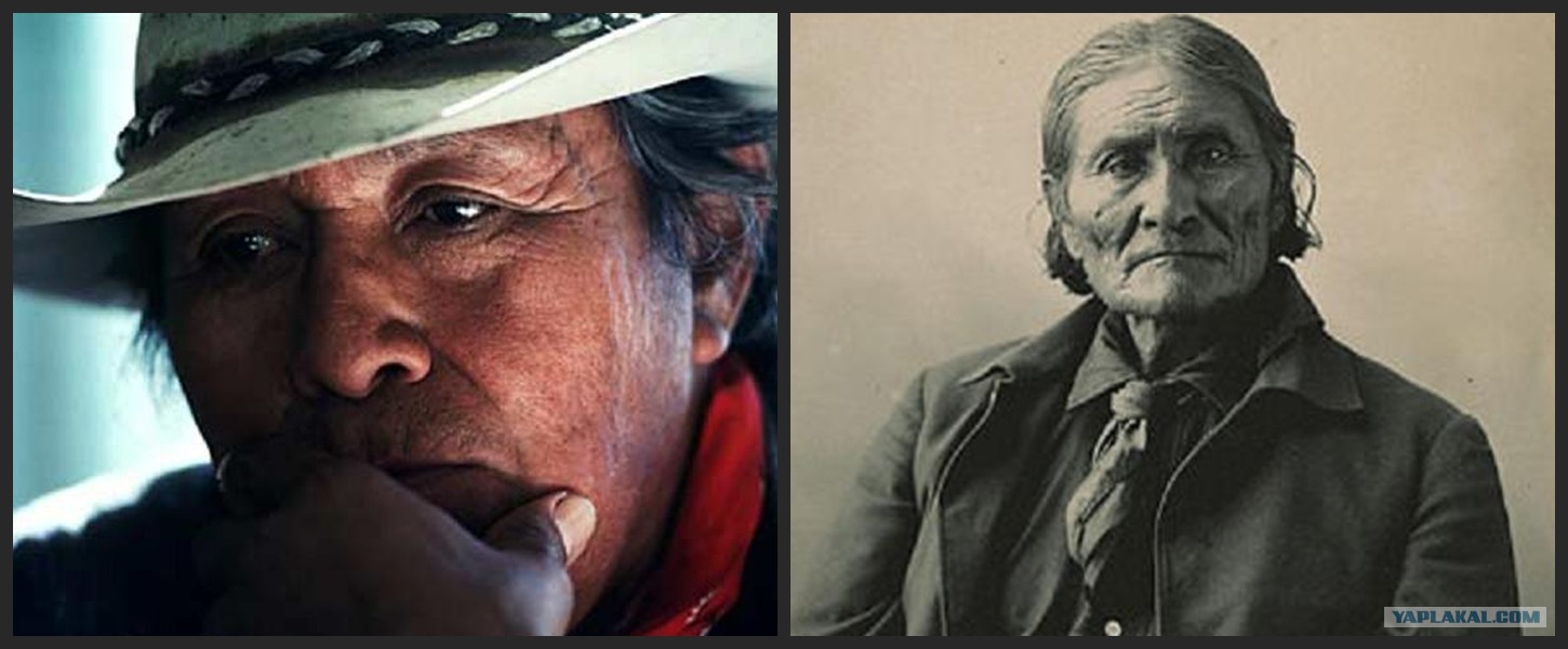 Вот слева на фото сделанном Брюсом запечатлен внук Джеронимо, того самого легендарного вождя индейцев, (он справа, фото из Википедии) который потеряв убитыми жену, детей и мать в течение почти тридцати лет сражался с мексиканскими и американскими войсками.