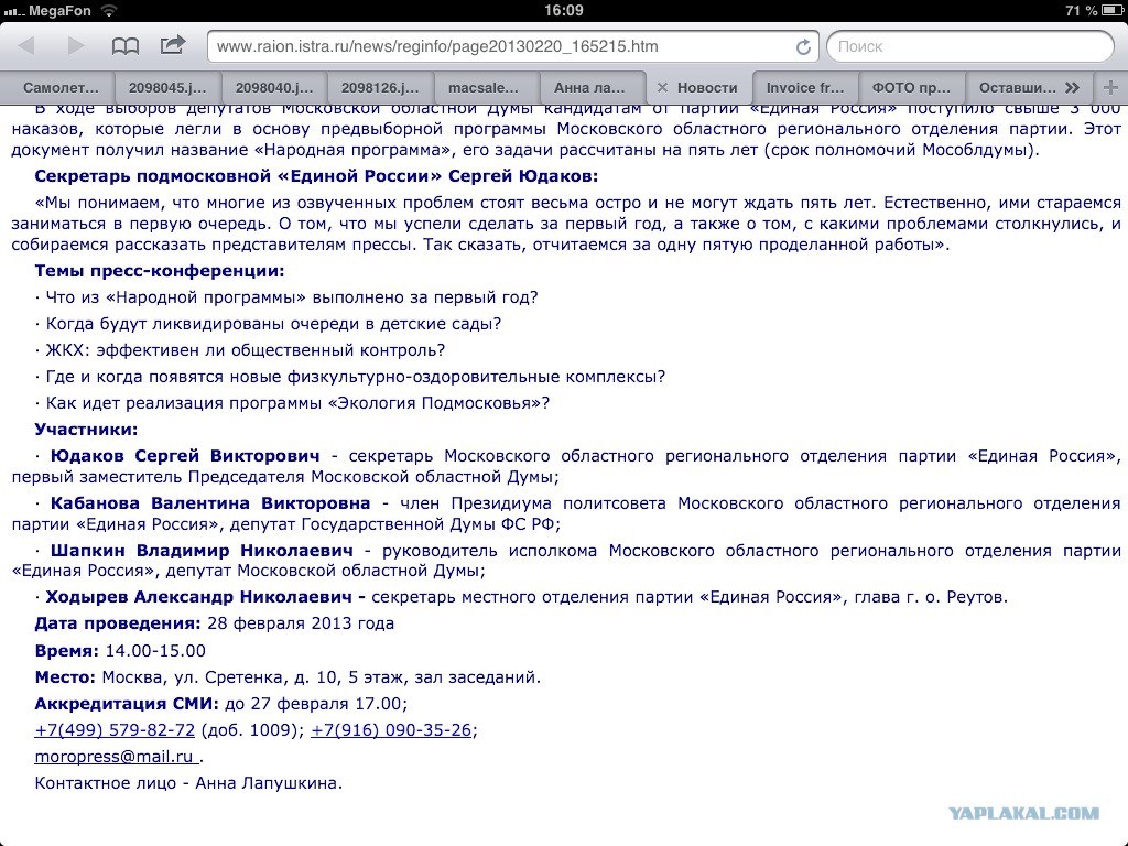 Аккредитация журналистов: До 17.00 24 мая 2013 года по тел.: +7(499) 579 82 72, доб. 10-09 или 8 916 090 35 26 (Анна Лапушкина). … Модератор – Ю.А. Липатов, член президиума регионального политсовета подмосковной «Единой России», депутат Государственной Думы.