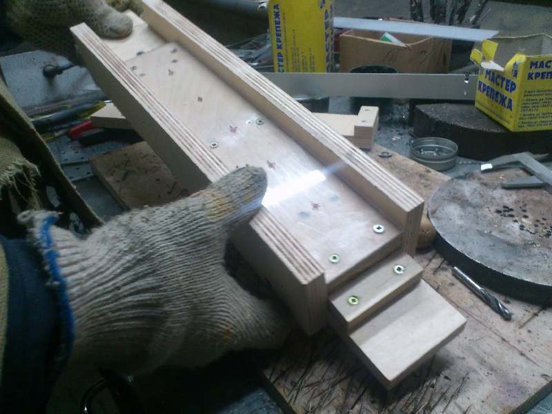 Товарищ что-то придумывает. Похоже на фанерную штуку с саморезами.