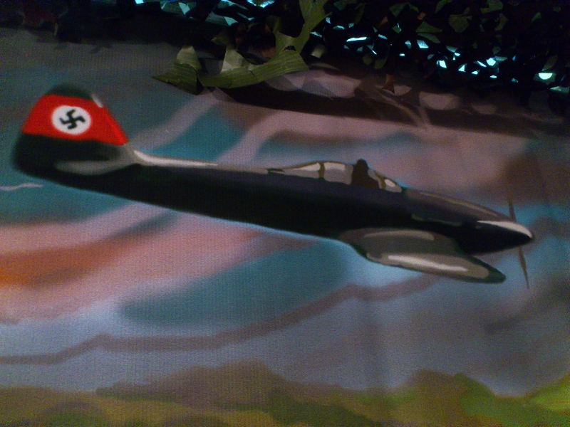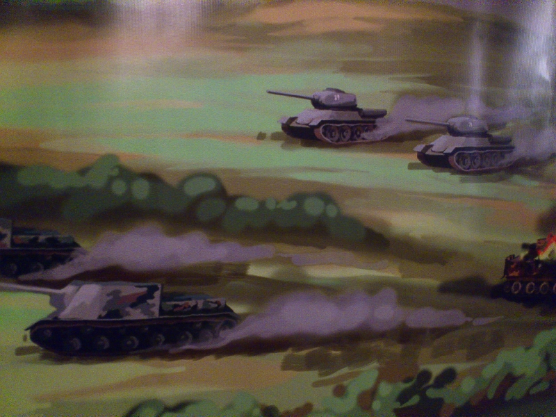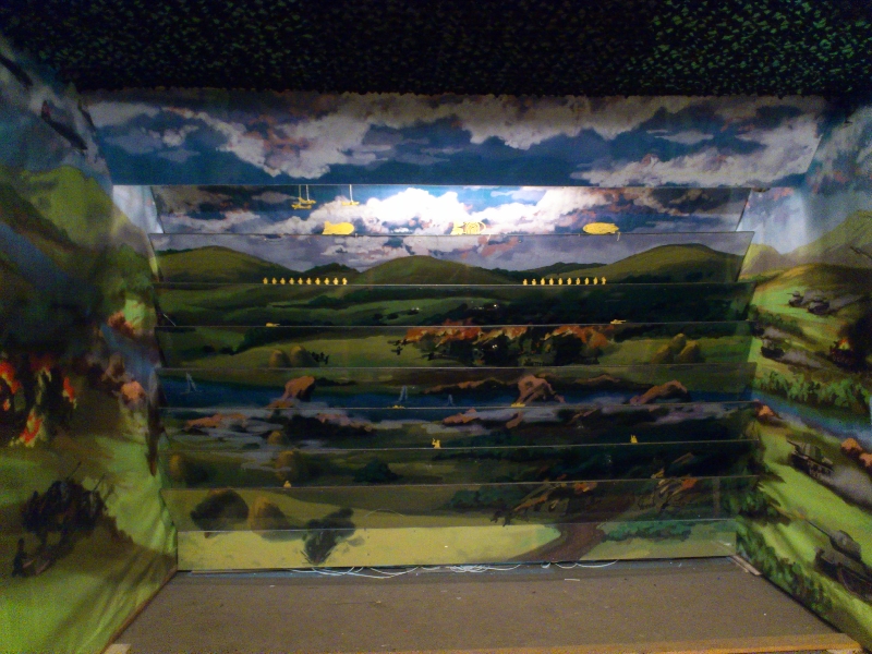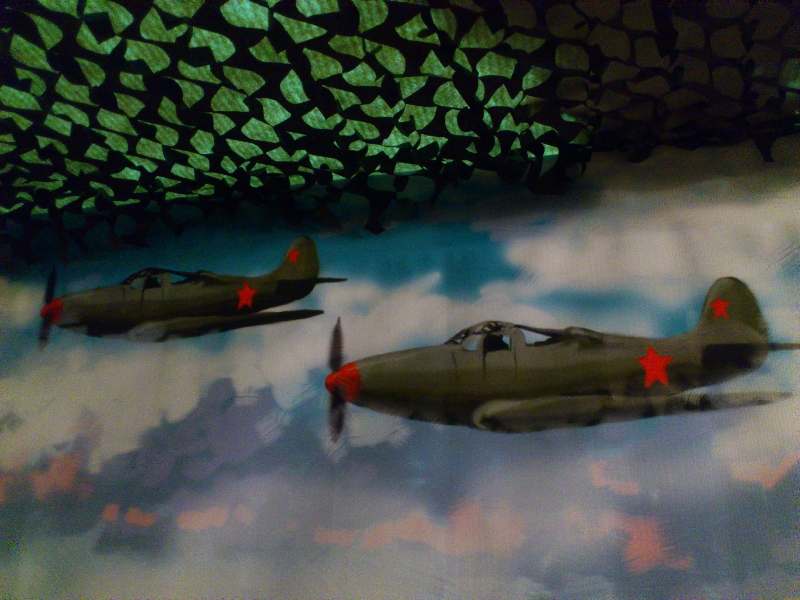 Внутри мы сделали панораму военных действий. Картинка переходит от стен к тыльной части. Это можно увидеть по реке, которую форсируют наши войска. Фашисты жгут деревни, наступают по земле, воде и воздуху. Задача наших юных стрелков – сбить атакующие действия противника и подавить агрессора.