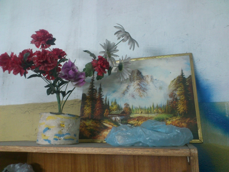 А теперь хочу показать нашу берлогу, где мы «химичим». На этом фото показана наша флора. Плюсов много: поливать не нужно, всегда цветет. По телеку всегда одна и та же передача про какой-то дом в горах. Хорошо что хотя бы без рекламы.