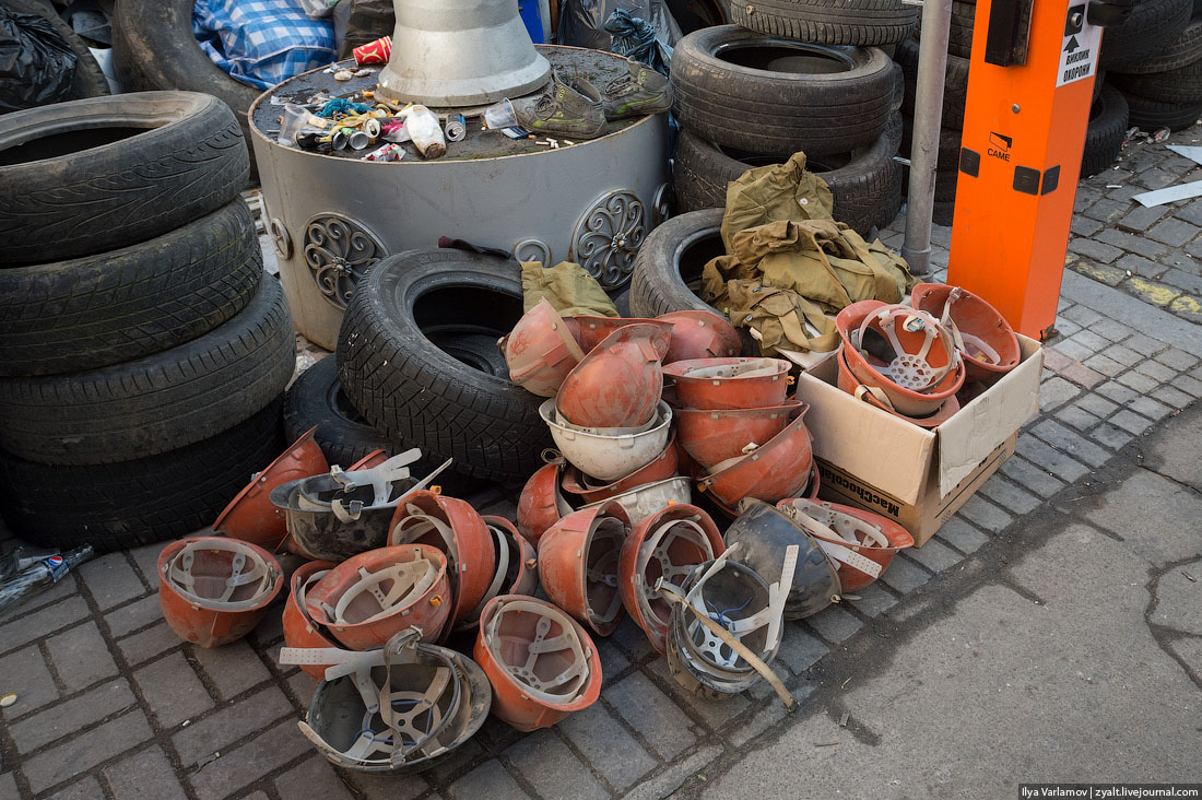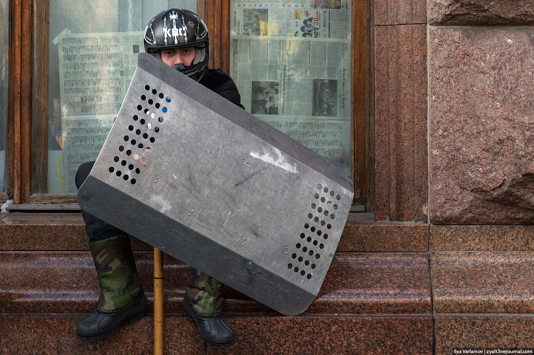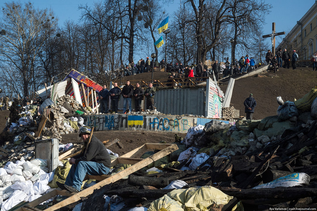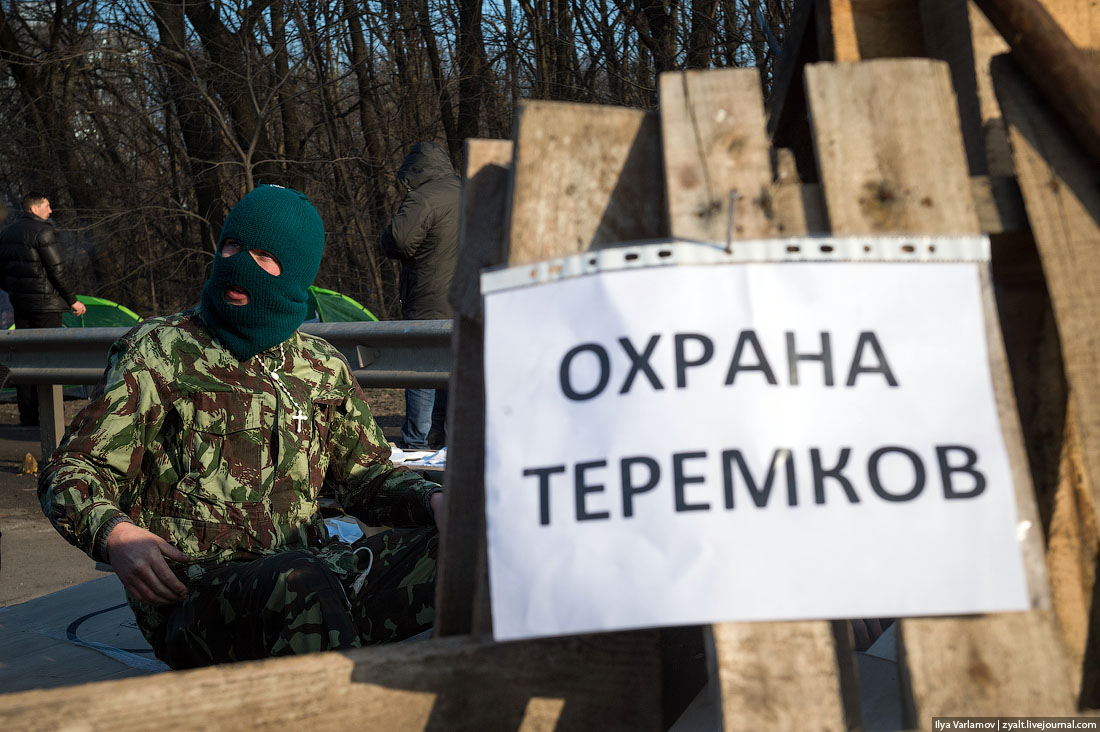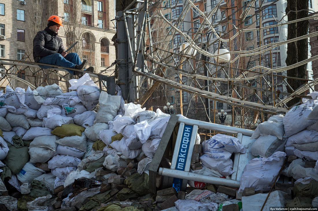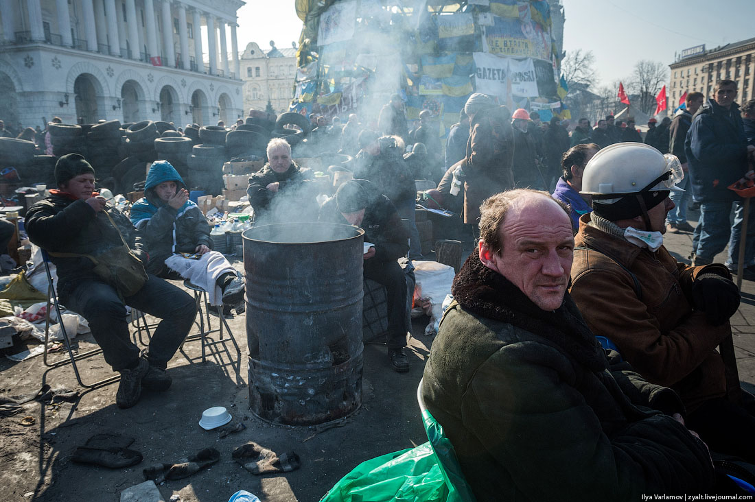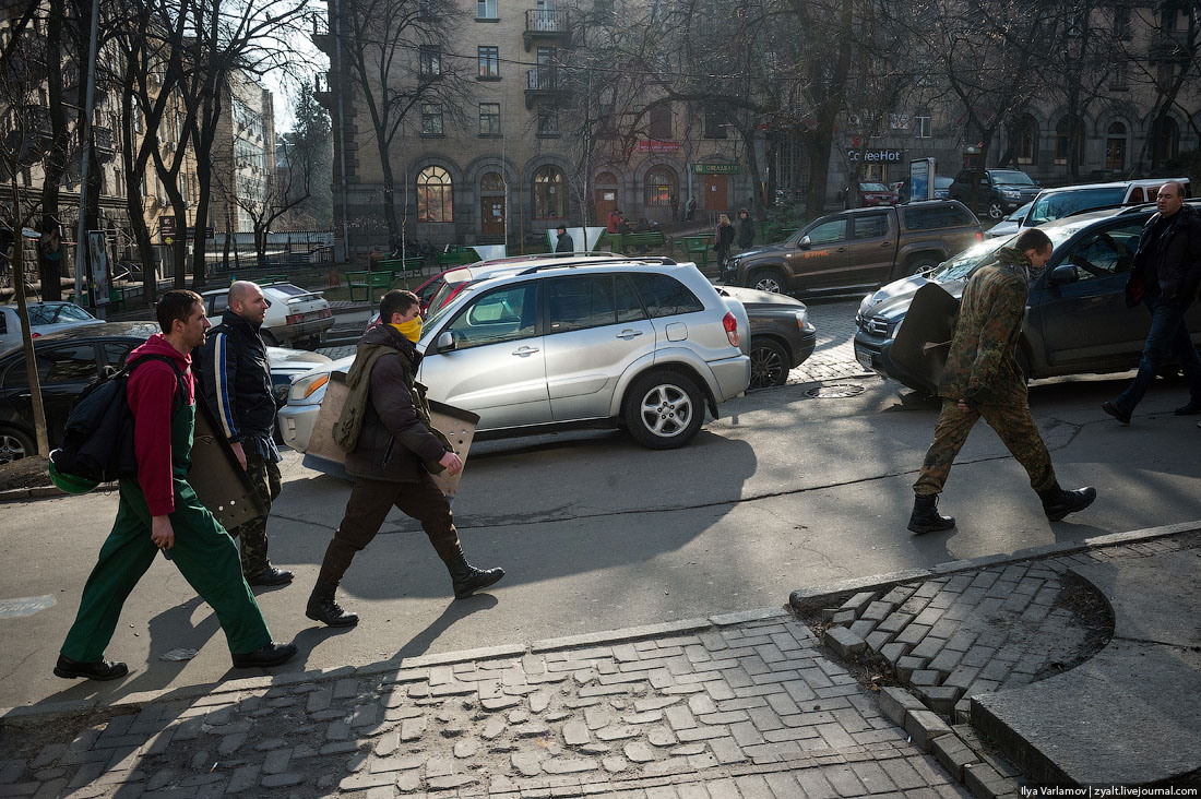 43. Охрана. Свой пост жители соорудили, посте того как 18 февраля к ним в район приехало несколько автобусов с титушками. У власти была идея скомпрометировать Майдан. Для этого в город из регионов нагнали гопоты, которая пыталась хулиганить, выдавая себя за людей с Майдана. Видимо власть рассчитывала, что киевляне встанут против Майдана, но киевляне быстро распознали подвох и встали на защиту своих районов.
