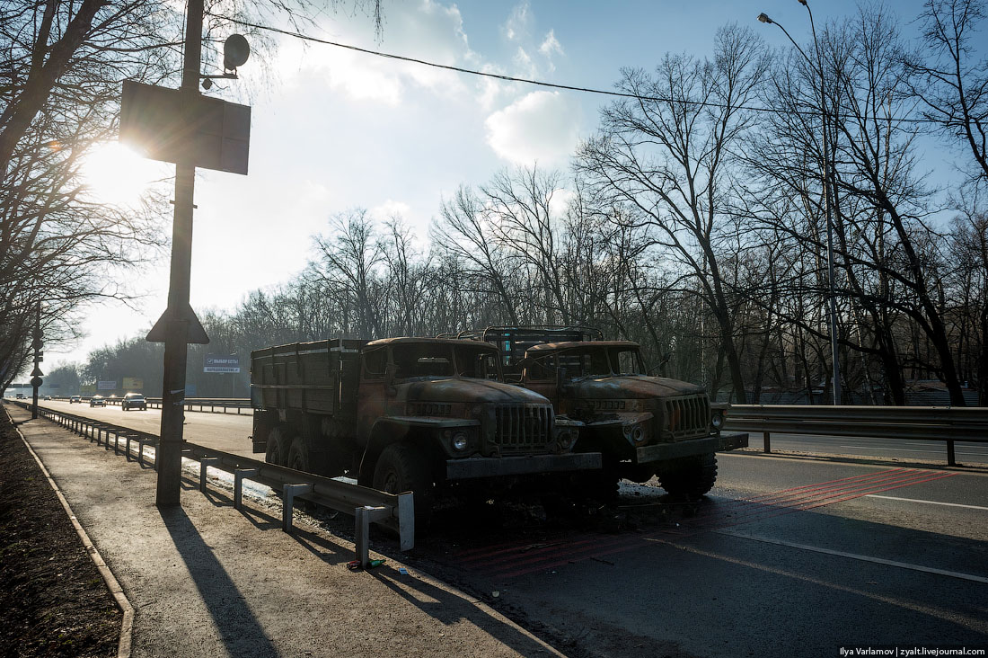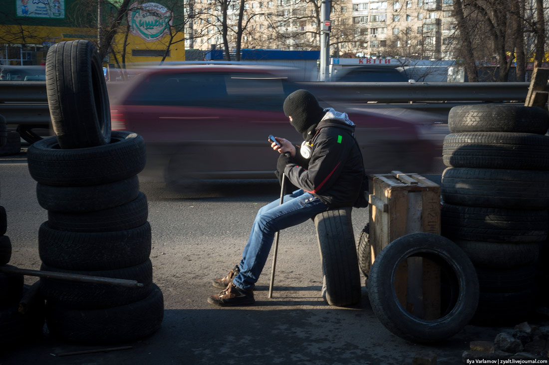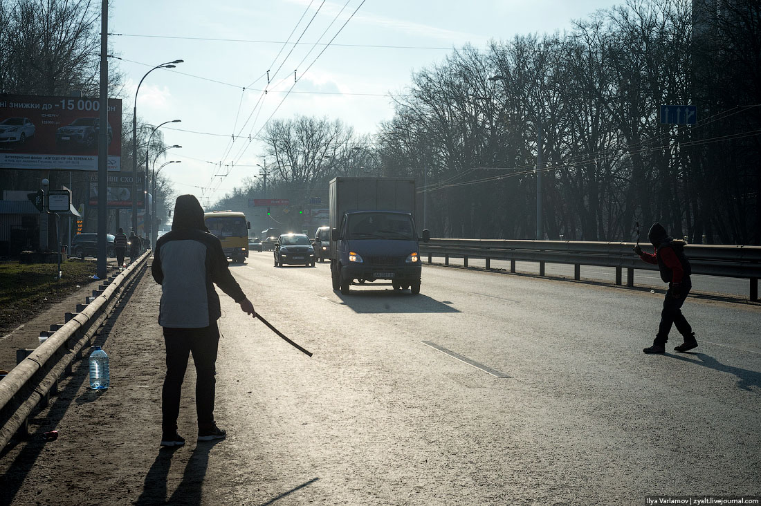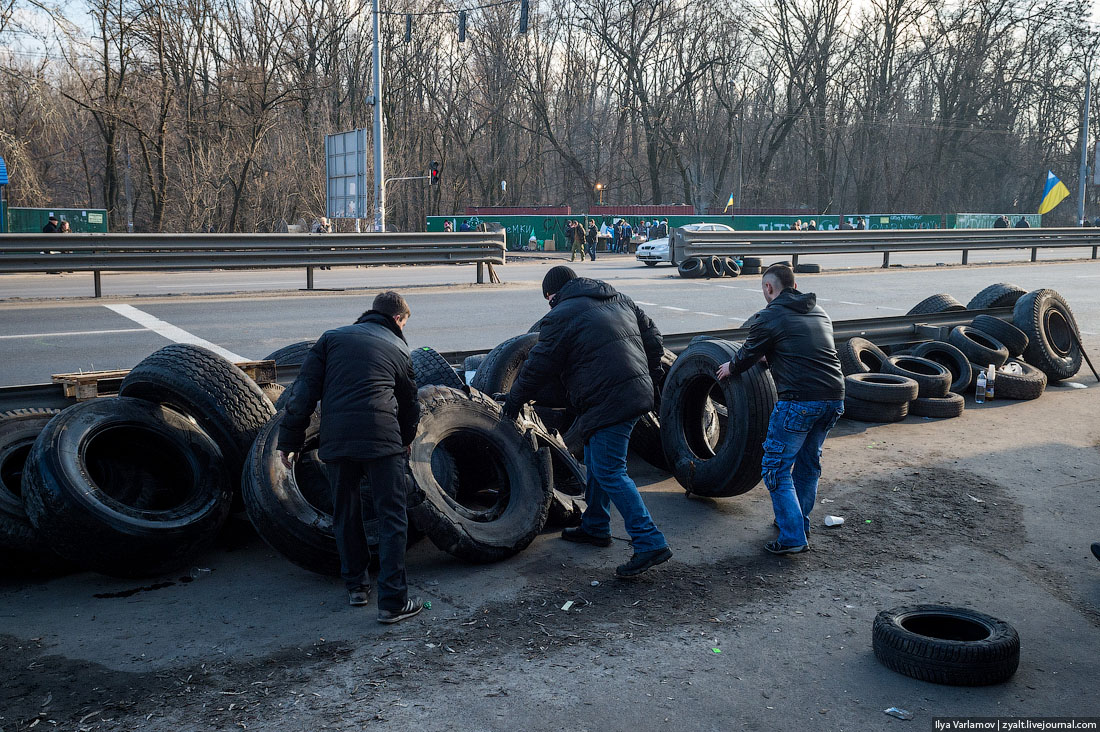 31. Если вы думаете, что события происходят только в центре, то ошибаетесь. Майдан давно уже захватил весь город. Это выезд из города, район Теремки. Вдоль дорог покрышки. Люди готовы перекрывать въезд в город в любой момент.