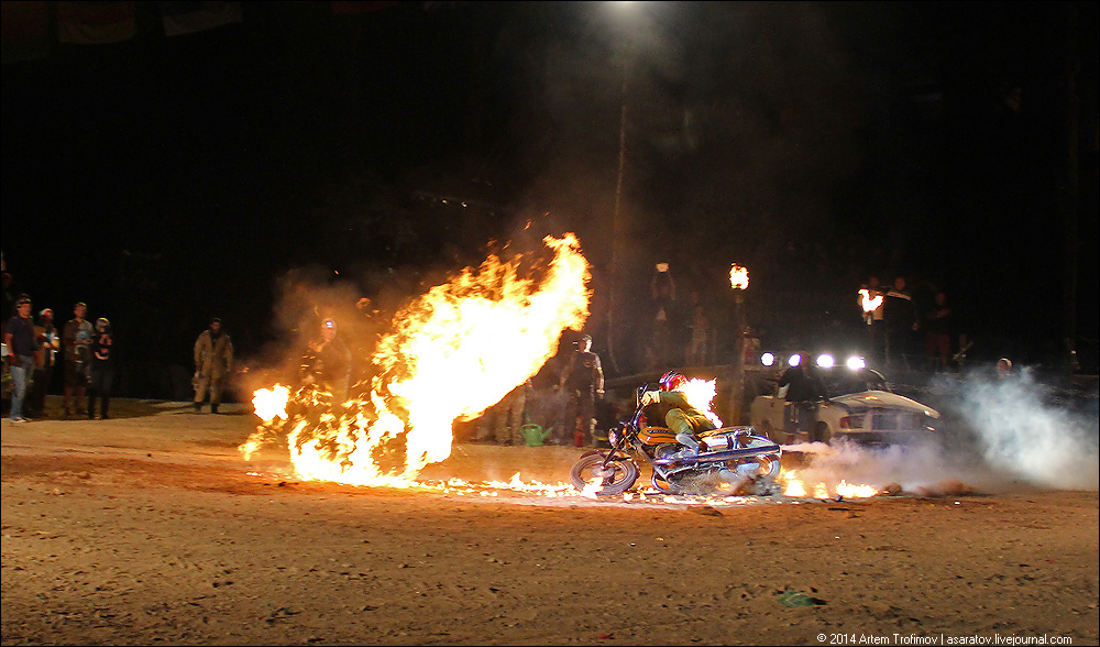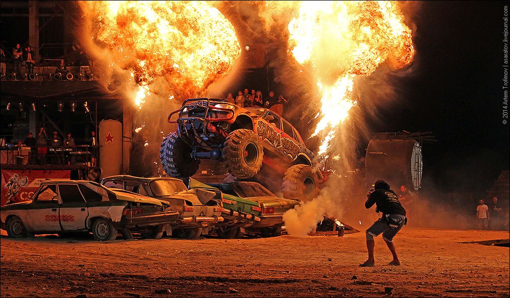 Два автомобиля со скоростью 100 км в час параллельно и одновременно переворачиваются в воздухе и касаются другу друга. Трюк называется "воздушный поцелуй по-русски". Этого еще никто и никогда не делал.