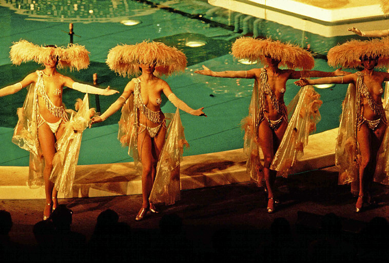 Вот, например, публику развлекают танцовщицы в Фридрихштадтпаласт, знаменитом музыкальном театра-варьете Восточного Берлина (фотограф Thomas Hoepker, 1984):
