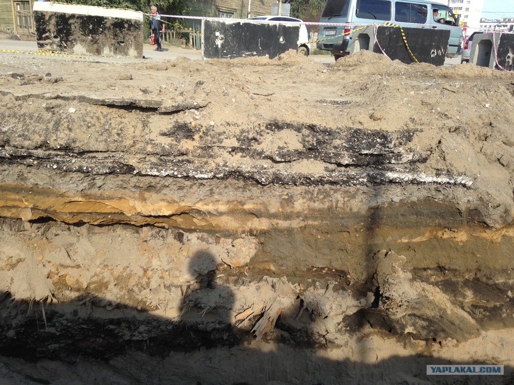 Или вот пример. По фотографии можно насчитать минимум девять слоев уложенного асфальта (не считая бетона и гравия). И это менее, чем за век!