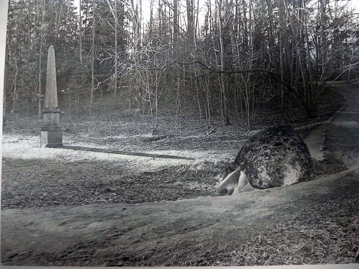 Это памятник Петру Алексеевичу Румянцеву-Задунайскому, поставленный его потомками. Состоял памятник из стеллы и головы. Стелла сейчас стоит в Петергофе, у Фермерского дворца, парк "Александрия. Голова осталась на месте.