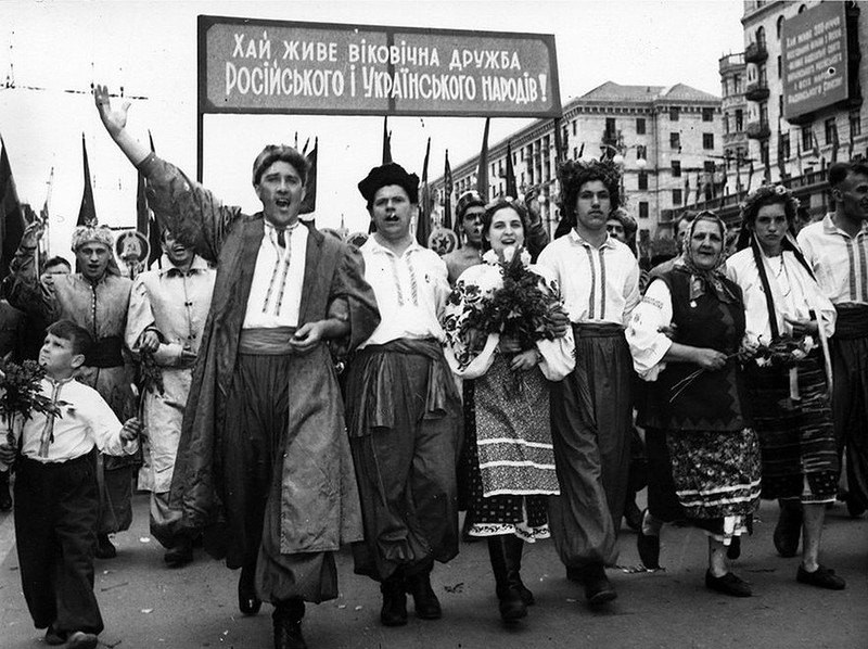 «Да здравствует вечная дружба российского и украинского народов! Россия и Украина – друзья навеки!» Первомайская демонстрация в Киеве, УССР, 1954 год.