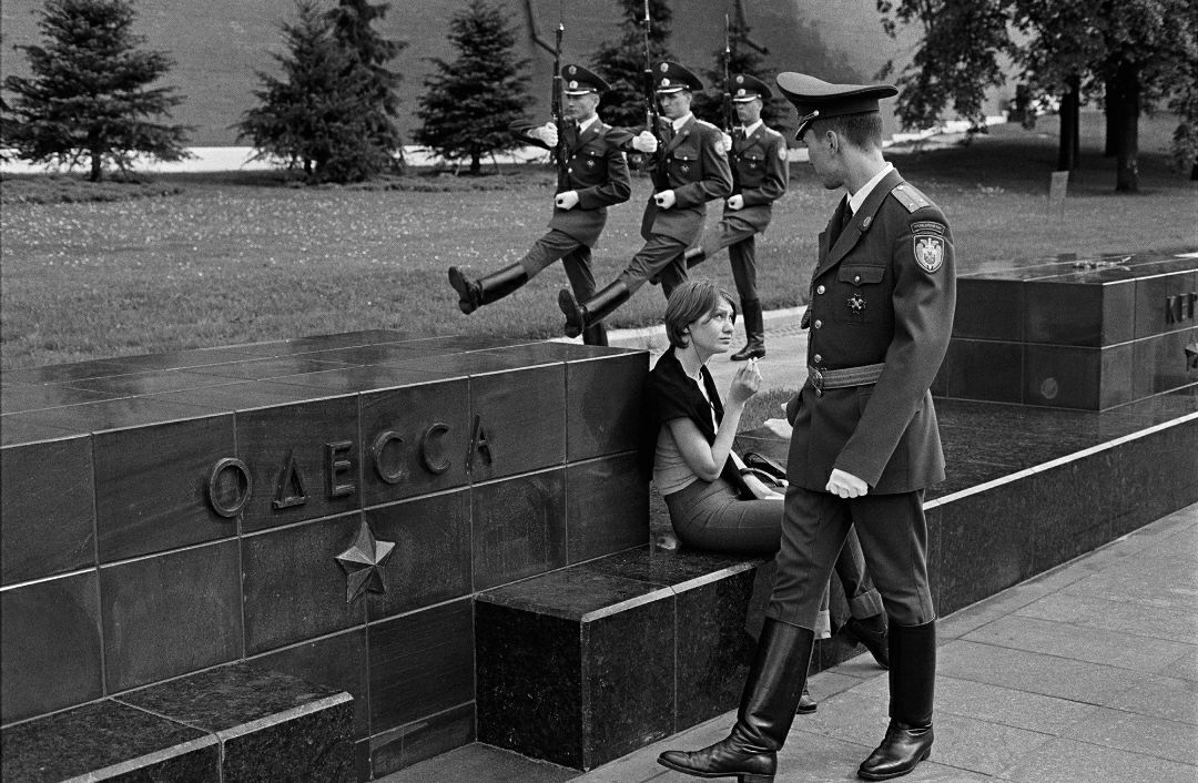 Обмен недовольными взглядами между солдатом 1-й роты Кремлёвского полка и курящей девушкой у стены Кремля, 2000 год.