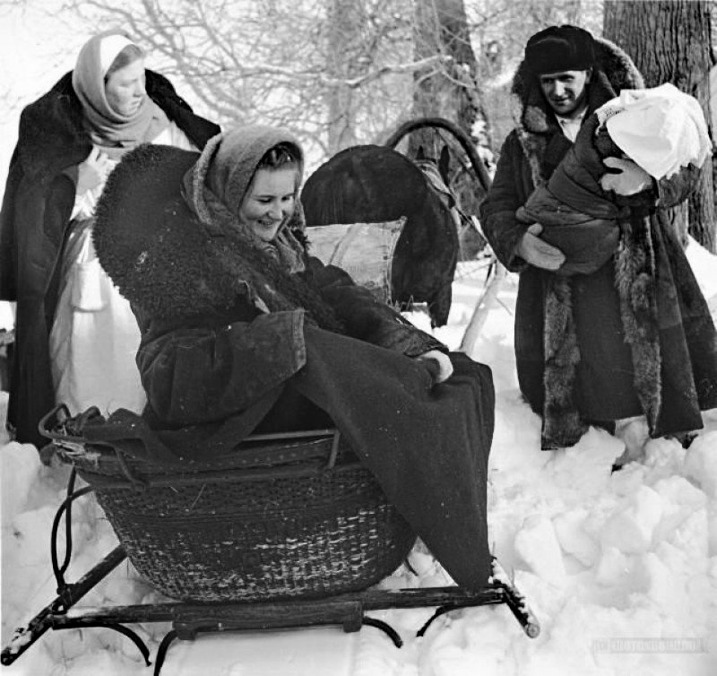 Муж забирает жену с ребёнком из роддома. СССР, 1950-е гг.