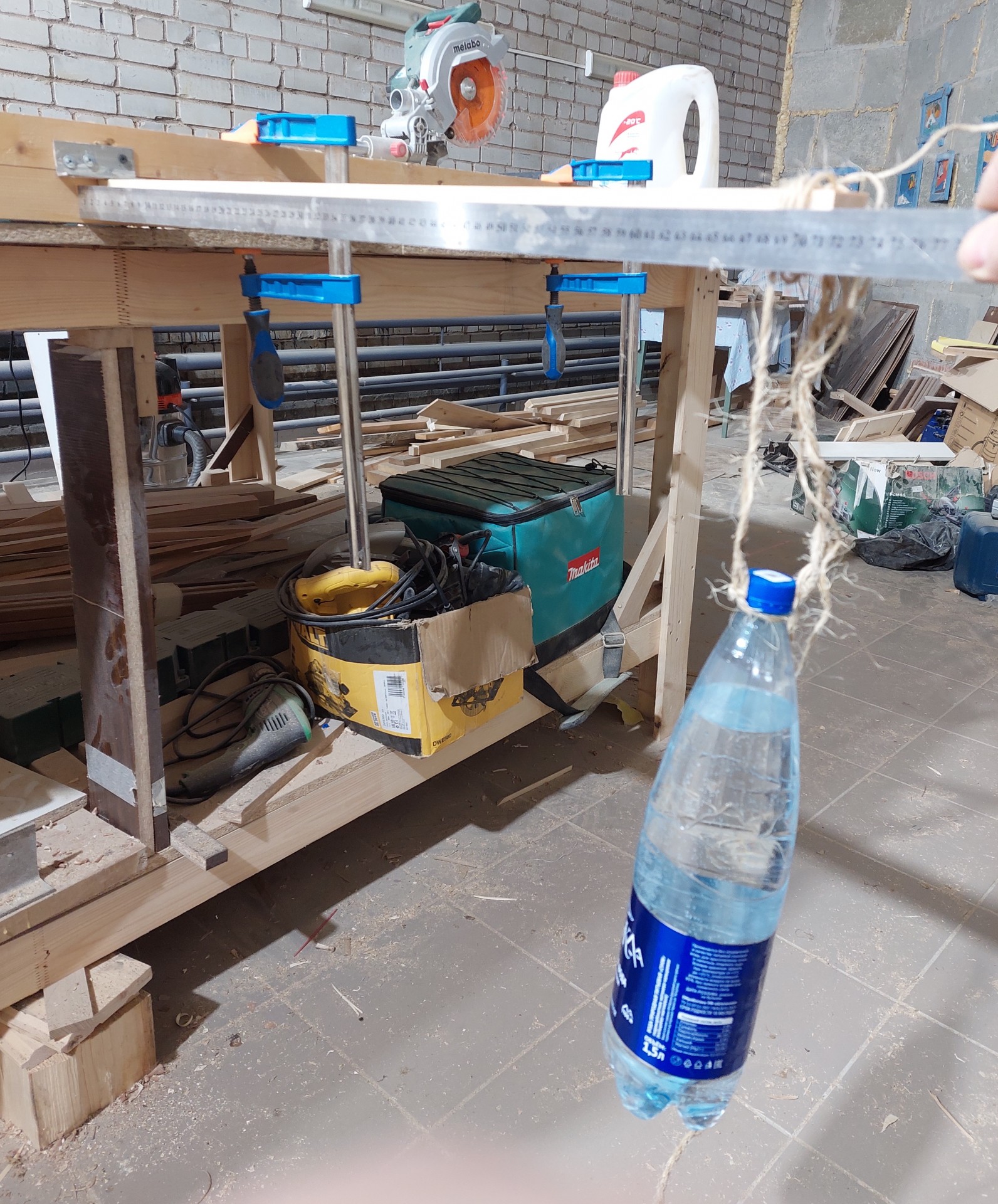 Чтобы сделать фаску, фрезер ведут по двум направляющим, так он идет ровно, и ровно срезает дерево. Одну направляющую крепим струбцинами за массив, вторую закрепляем на козлах рядом, выровняв их уровнем. И ведем фрезер как обычно)