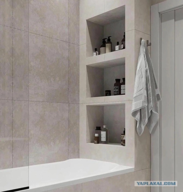 у меня кирпич был, как раз туда выложил перегородку, чтоб ванна крепче стояла. Немного профиля по периметру проема, сверху гипсокартона кусок. Плитку из остатков в магазине белую подобрал. Швы белым герметиком санитарным заделал. Теперь как полка дополнительная.