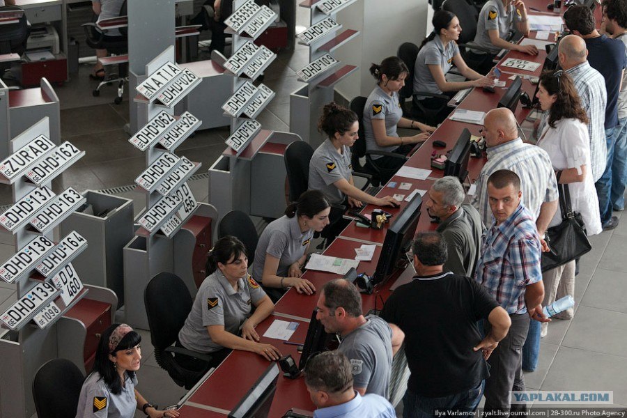 Ещё был случай, когда списанные уазики и грузовик ушли с аукциона. Контора, где я работал, купила грузовик, поэтому я там присутствовал при оформлении. Так вот, так как техника долго стояла и не вся заводилась - пожалуста, не надо никому взятку за досмотр без автомобиля. Вызвали сотрудника (официально оплатив символическую цену в банке), он приехал, осмотрел машины на месте, после чего вместе с ним всей делегацией поехали в Рустави за документами. В течении часа было оформленно все шесть машин ( с учётом, что мне нужен был номер где буквы были абревиатурой названия компании, а цифри 00х - порядковый номер машины). Номер такого типа без проблем, 120$ примерно, опять таки в банк.