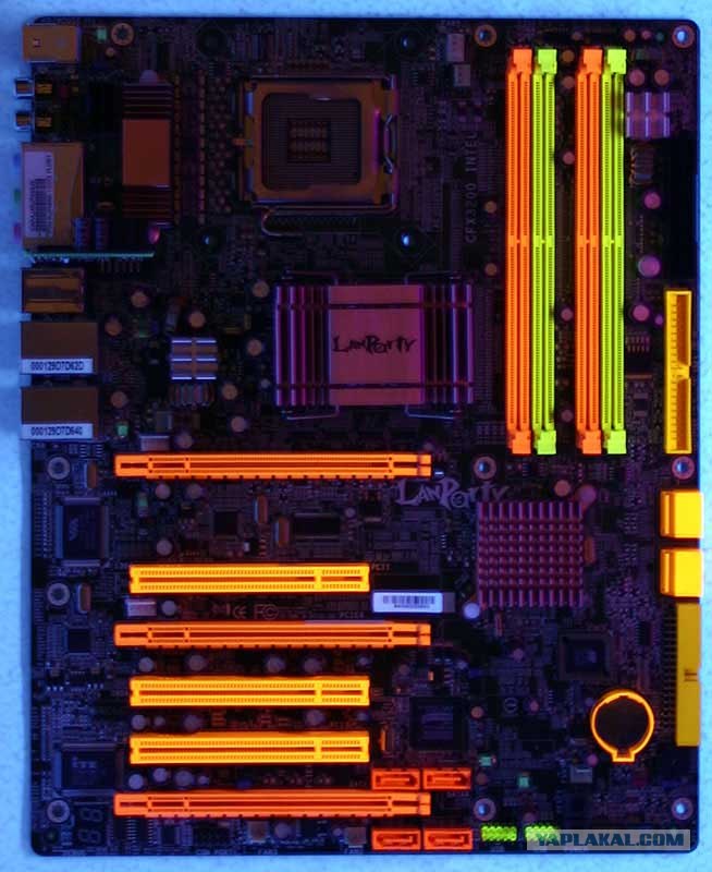 Платы DFI кроме своих выдающихся возможностей разгона, выделялись еще и оригинальным ярким внешним видом. Вот так, например, выглядит DFI LANParty UT ICFX3200-T2R/G в ультрафиолете.